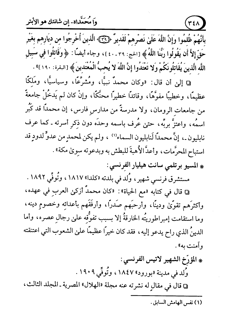° إلى أن قال: "وكان محمدٌ نبيًّا، ومُشرِّعًا، وسياسيًّا، ومَلِكًا عظيمًا، وخطيبًا مفوَّهًا، وقائدًا خطيرًا محنَّكًا، وإنْ كان لم يَدخُلْ جامعةً من جامعاتِ الرومان، ولا مدرسةً من مدارسِ فارس، إن محمدًا قد كَبُر اسمُه، واعتزَّ بربِّه، حتى عُرف باسمه وحدَه دون ذِكرِ أسرته -كما عرف نابليون-، إنَّ محمدًا لَنابليون السماء (¬1)، ولم يكن لمحمدٍ من عدوٍّ لدودٍ قد استباح المحرَّمات، وأعدَّ الأُهبةَ للبطش به وبدعوته سِوى مكة".