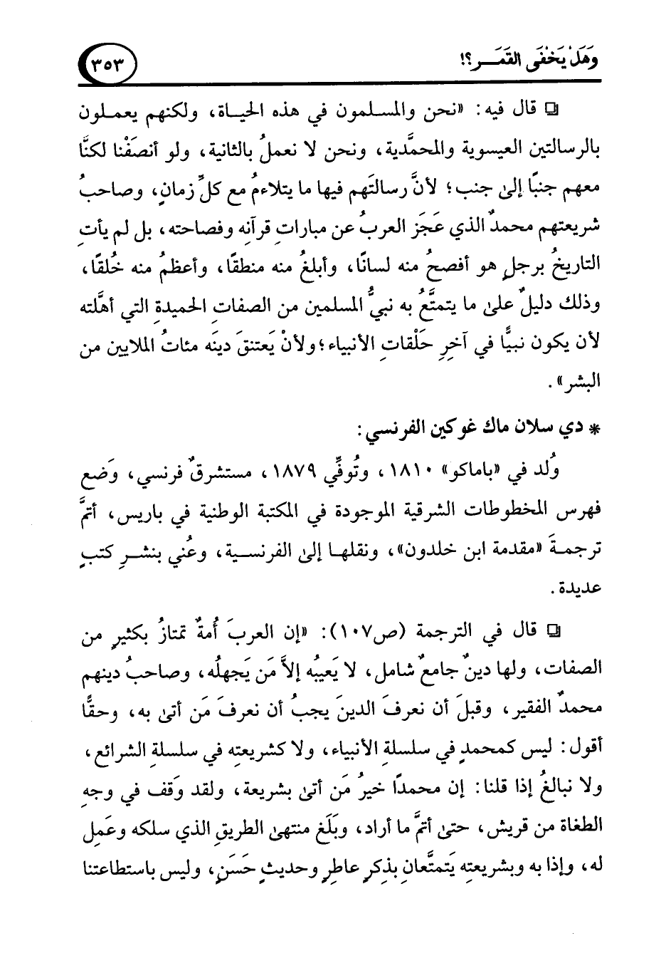 ° قال في الترجمة (ص 107): "إن العربَ أُمةٌ تمتازُ بكثيرٍ من الصفات، ولها دينٌ جامع شامل، لا يَعيبُه إلاَّ مَن يَجهلُه، وصاحبُ دينهم محمدٌ الفقير، وقبلَ أن نعرفَ الدينَ يجبُ أن نعرفَ مَن أتى به، وحقًّا أقول: ليس كمحمدٍ في سلسلةِ الأنبياء، ولا كشريعتِه في سلسلةِ الشرائع، ولا نبالغُ إذا قلنا: إن محمدًا خيرُ مَن أتى بشريعة، ولقد وَقف في وجهِ الطغاة من قريش، حتى أتمَّ ما أراد، وبَلَغ منتهى الطريقِ الذي سلكه وعَمِل له، وإذا به وبشريعتِه يَتمتَّعانِ بذِكرٍ عاطِرٍ وحديثٍ حَسَنٍ، وليس باستطاعتنا