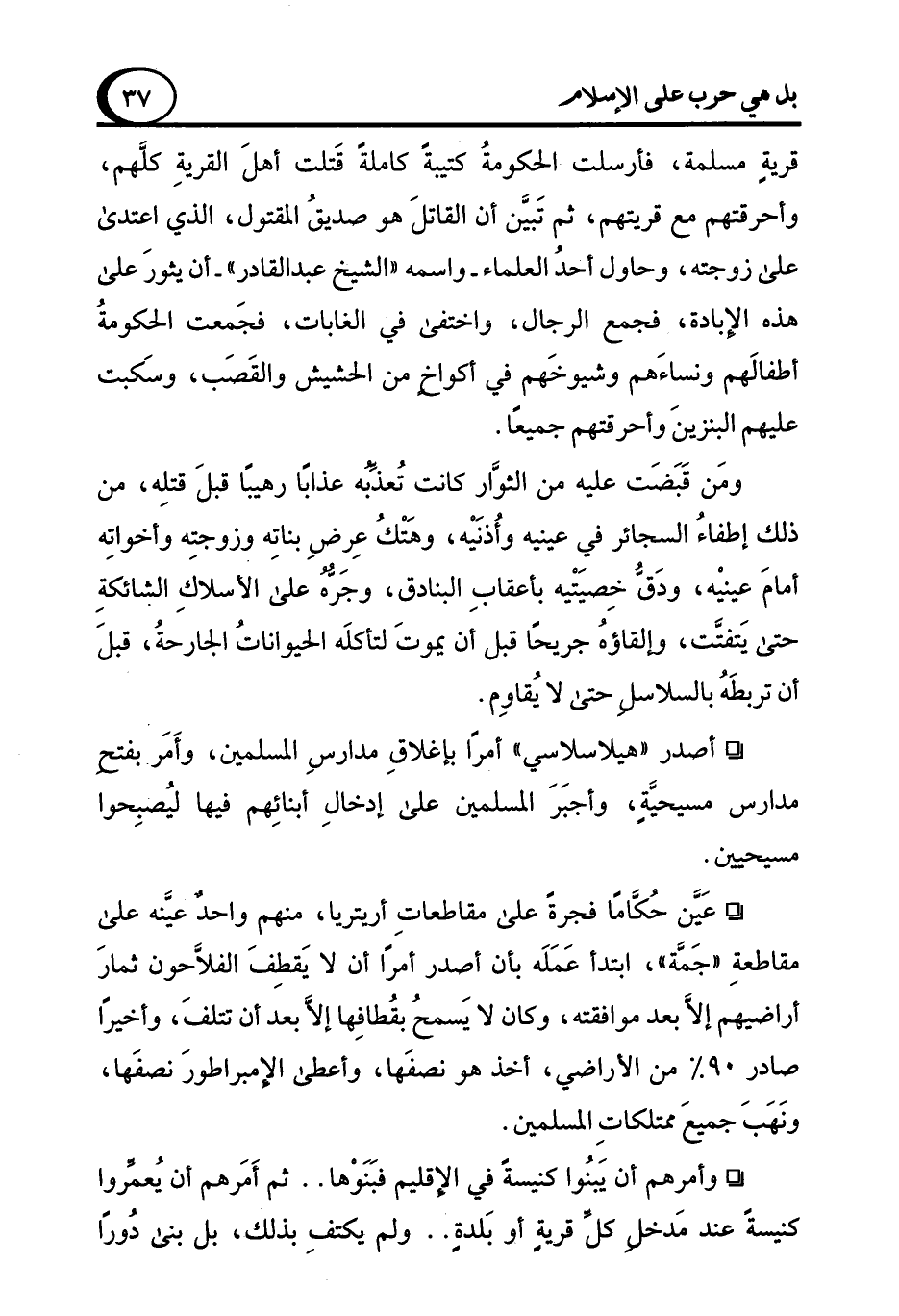 قريةٍ مسلمة، فأرسلت الحكومةُ كتيبةً كاملةً قَتلت أهلَ القريةِ كلَّهم، وأحرقتهم مع قريتهم، ثم تَبيَّن أن القاتلَ هو صديقُ المقتول، الذي اعتدى على زوجته، وحاول أحدُ العلماء -واسمه "الشيخ عبد القادر"- أن يثورَ على هذه الإبادة، فجمع الرجال، واختفى في الغابات، فجَمعت الحكومةُ أطفالَهم ونساءَهم وشيوخَهم في أكواخ من الحشيش والقَصَب، وسَكبت عليهم البنزينَ وأحرقتهم جميعًا.