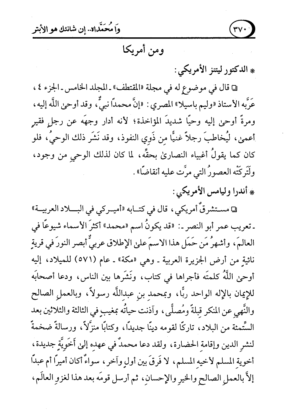 ° مستشرقٌ أمريكي، قال في كتابه "أميركي في البلاد العربية" -تعريب عمر أبو النصر-: "قد يكون اسم "محمد" أكثرَ الأسماء شيوعًا في العالمَ، وأشهرُ مَن حَمَل هذا الاسمَ على الإِطلاق عربي أبصر النورَ في قريةٍ نائيةٍ من أرض الجزيرة العربية -وهي "مكة"- عام (571) للميلاد، إليه أوحى اللهُ كلمتَه فأجراها في كتاب، ونَشَرها بين النالس، ودعا أصحابَه للإيمان بالإله الواحد ربًّا، وبمحمدِ بنِ عبدِ الله رسولاً، وبالعمل الصالح والنَّهيِ عن المنكر قِبلةً ومُصلًّى، وآذنت حياتُه بمغيبٍ في الثالثة والثلاثين بعد السِّتمئة من البلاد، تاركًا لقومه دينًا جديدًا، وكتابًا منزَّلاً، ورسالةً ضخمةً لنشرِ الدين وإقامةِ الحضارة، ولقد دعا محمد في عهدِه إلى أَخَوِيَّةٍ جديدة، أخويةِ المسلم لأخيهِ المسلم، لا فَرقَ بين أولٍ وآخر، سواءٌ أكان أميرًا أم عبدًا إلاَّ بالعملِ الصالحِ والخيرِ والإحسانِ، ثم أرسل قومَه بعد هذا لغزوِ العالَم،