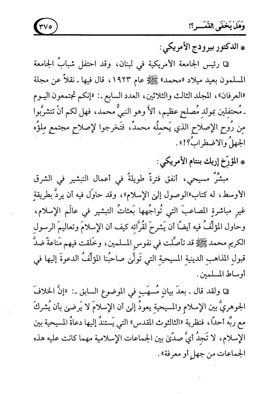 ° ولقد قال -بعدَ بيانٍ مُسهَبٍ في الموضوع السابق-: "إنَّ الخلافَ الجوهريَّ بين الإسلامِ والمسيحيةِ يعودُ إلى أن الإسلامَ لا يَرضى بأن يُشركَ مع ربِّه أحدًا، فنظرية "الثالثوث المقدس" التى يَستندُ إليها دعاةُ المسيحية بين الإسلام، لا تَجِدُ أيَّ صدًى بين الجماعات الإسلامية مهما كانت عليه هذه الجماعات من جهلٍ أو معرفة".