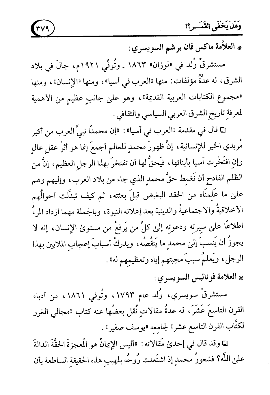 ° قال في مقدمة: "العرب فى آسيا": "إن محمدًا نبيَّ العرب من أكبر مُريدي الخير للإِنسانية، إنَّ ظهورَ محمدٍ للعالم أجمعَ إنما هو أثرُ عقلٍ عالٍ وإنِ افتَخْرت آسيا بأبنائها، فيَحقُّ لها أن تفتخرَ بهذا الرجلِ العظيم، إنَّ من الظلم الفادحِ أن نَغمِط حقَّ محمدٍ الذي جاء من بلاد العرب، وإليهم وهم على ما عَلِمنَاه من الحقد البغيض قبلَ بعثته، ثم كيف تبدَّلت أحوالُهم الأخلاقيةُ والاجتماعيةُ والدينية بعد إعلانه النبوة، وبالجملة مهما ازداد المرءُ اطلاعًا على سِيرتِه ودعوتِه إلى كل من يَرفعُ من مستوى الإنسان، إنه لا يجوزُ أن يَنسبَ إلى محمدٍ ما يَنقُصُه، ويدركُ أسبابَ إعجابِ الملايين بهذا الرجل، ويَعلمُ سببَ محبتهم إياه وتعظيمِهم له".