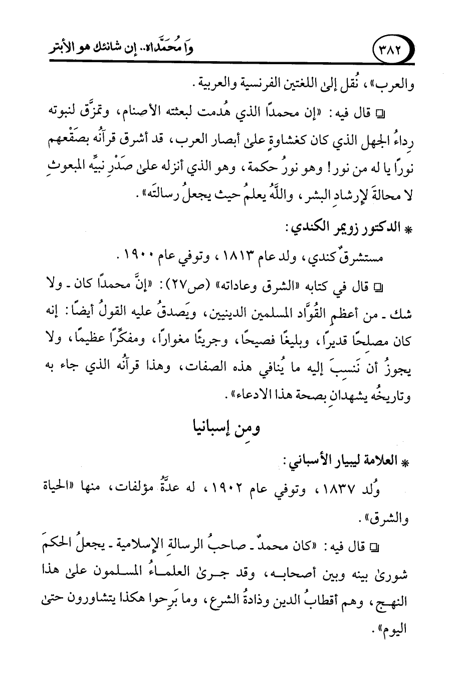 ° قال فيه: "إن محمدًا الذي هُدمت لبعثته الأصنام، وتمزَّق لنبوته رِداءُ الجهل الذي كان كغشاوةٍ على أبصار العرب، قد أشرق قرآنُه بصَقْعهم نورًا يا له من نور! وهو نورُ حكمة، وهو الذي أنزله على صَدْرِ نبيِّه المبعوثِ لا محالةَ لإِرشادِ البشر، واللهُ يعلمُ حيث يجعلُ رسالتَه".