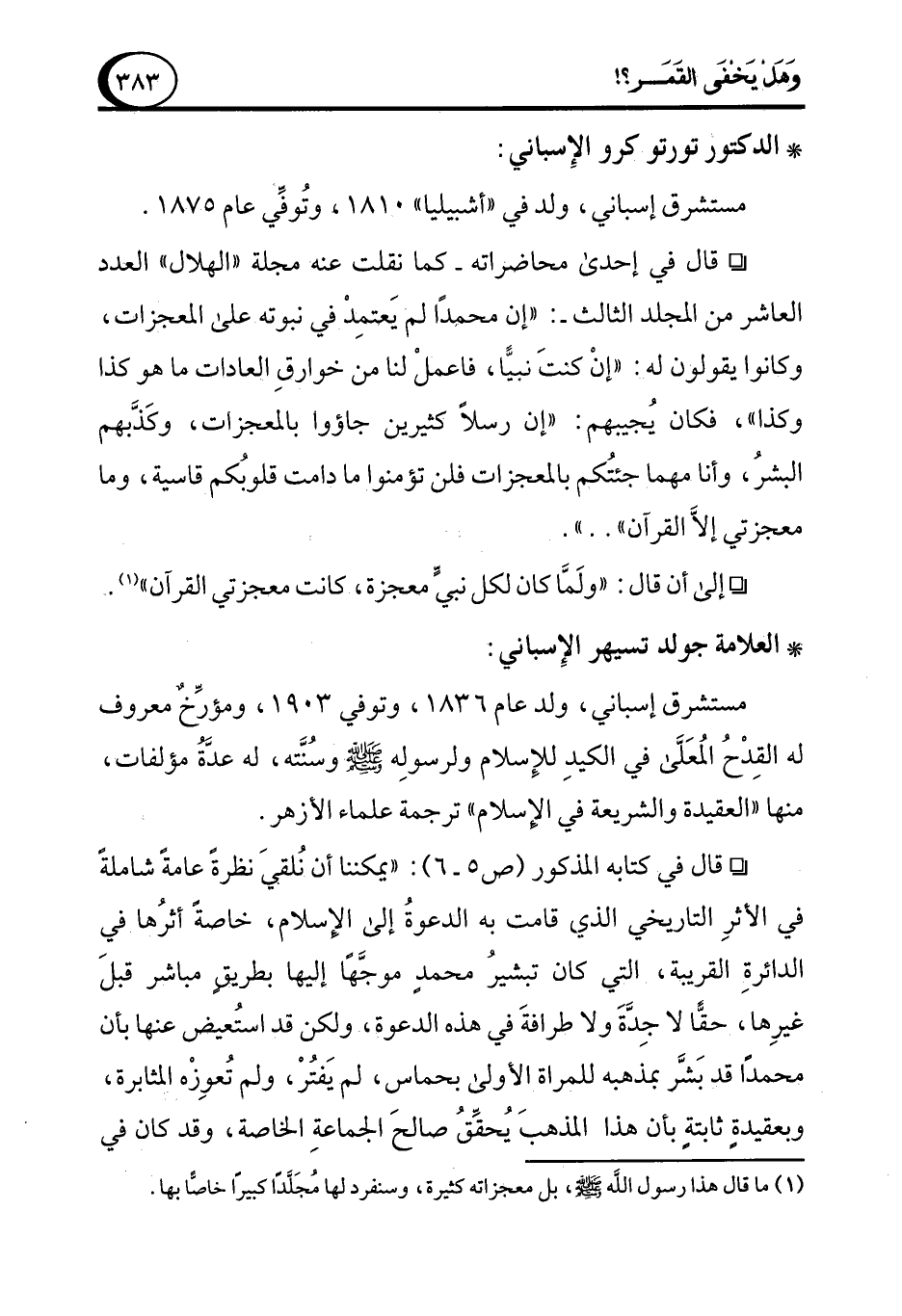 ° قال في كتابه المذكور (ص5 - 6): "يمكننا أن نُلقيَ نظرةً عامةً شاملةً في الأثرِ التاريخي الذى قامت به الدعوةُ إلى الإسلام، خاصةً أثرُها في الدائرةِ القريبة، التي كان تبشيرُ محمدٍ موجَّهًا إليها بطريقٍ مباشر قبلَ غيرِها، حقًّا لا جِدَّةَ ولا طرافةَ في هذه الدعوة، ولكن قد استُعيض عنها بأن محمداً قد بَشَّر بمذهبه للمراة الأولى بحماس، لم يَفتُرْ، ولم تُعوِزْه المثابرة، وبعقيدة ثابتةٍ بأن هذا المذهبَ يُحقِّقُ صالحَ الجماعةِ الخاصة، وقد كان في