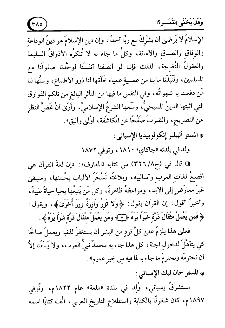 ° قال في (ج 8/ 326) من كتابه "المعارف": "إن لغةَ القرآن هي أفصحُ لغاتِ العربِ وأساليبه، وبلاغتُه تَسْحَرُ الألباب بحُسنها، وسيبقى غيرَ معارَضِ إلى الأبد، ومواعظةُ ظاهرةٌ، وكل مَن يَتبعُها يحيا حياةً طيبةً، وأخيرًا أقول: إن القرآن يقول: {وَلا تَزِرُ وَازِرَةٌ وِزْرَ أخرَى}، ويقول: {فَمَن يَعْمَلْ مِثْقَالَ ذَرَّةٍ خَيْرًا يَرَهُ (7) وَمَن يَعْمَلْ مِثْقَالَ ذَرَّةٍ شَرًّا يَرَهُ}.
