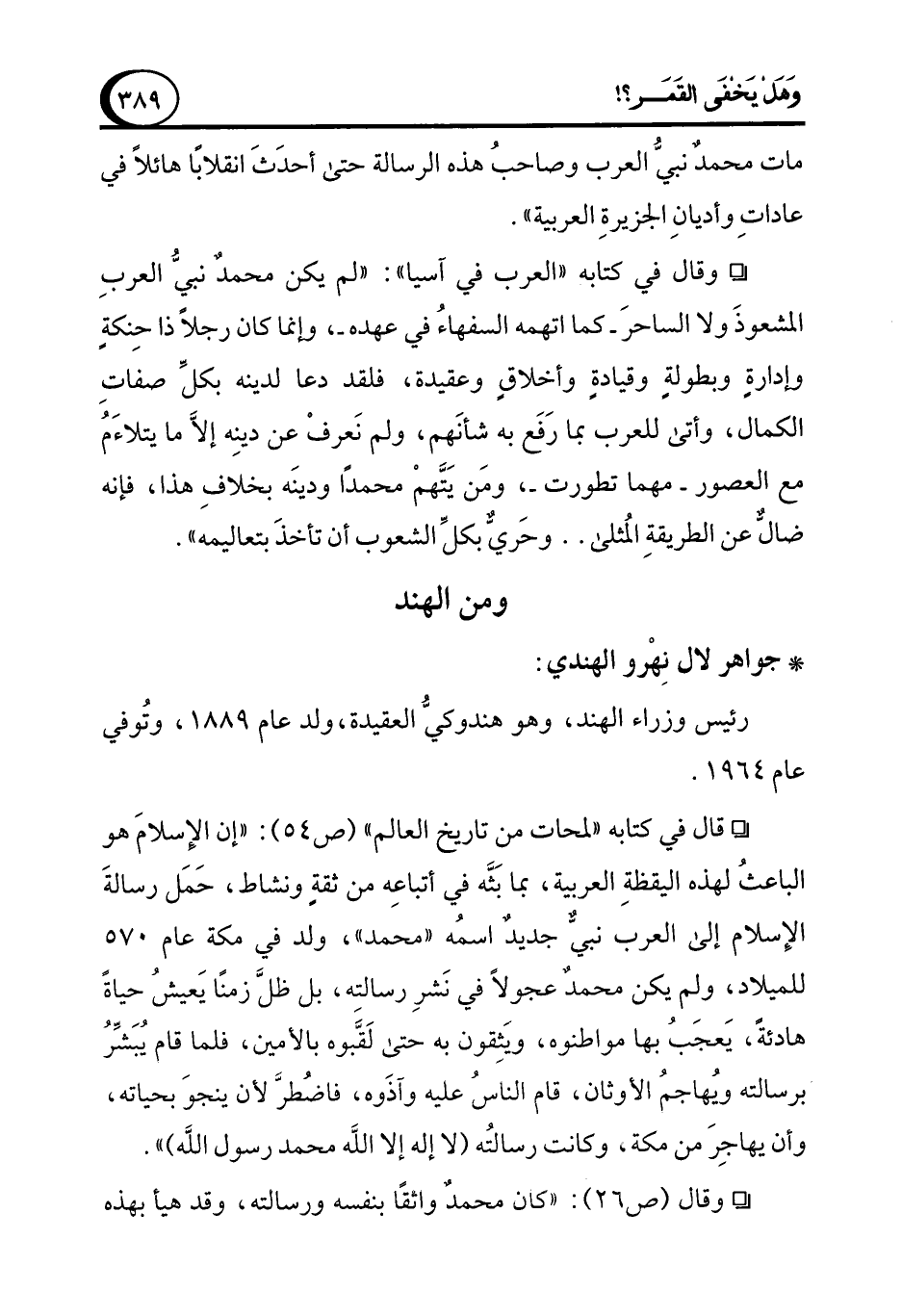° قال في كتابه "لمحات من تاريخ العالم" (ص 54): "إن الإسلامَ هو الباعثُ لهذه اليقظةِ العربية، بما بَثَّه في أتباعِه من ثقةٍ ونشاط، حَمَل رسالةَ الإسلام إلى العرب نبيٌّ جديدٌ اسمُه "محمد"، ولد في مكة عام 570 للميلاد، ولم يكن محمدٌ عجولاً في نَشرِ رسالتِه، بل ظلَّ زمنًا يَعيشُ حياةً هادئةً، يَعجَبُ بها مواطنوه، ويَثِقون به حتى لَقَّبوه بالأمين، فلما قام يُبَشِّرُ برسالته ويُهاجمُ الأوثان، قام الناسُ عليه وآذَوه، فاضُطرَّ لأن ينجوَ بحياته، وأن يهاجِرَ من مكة، وكانت رسالتُه (لا إله إلا الله محمد رسول الله) ".