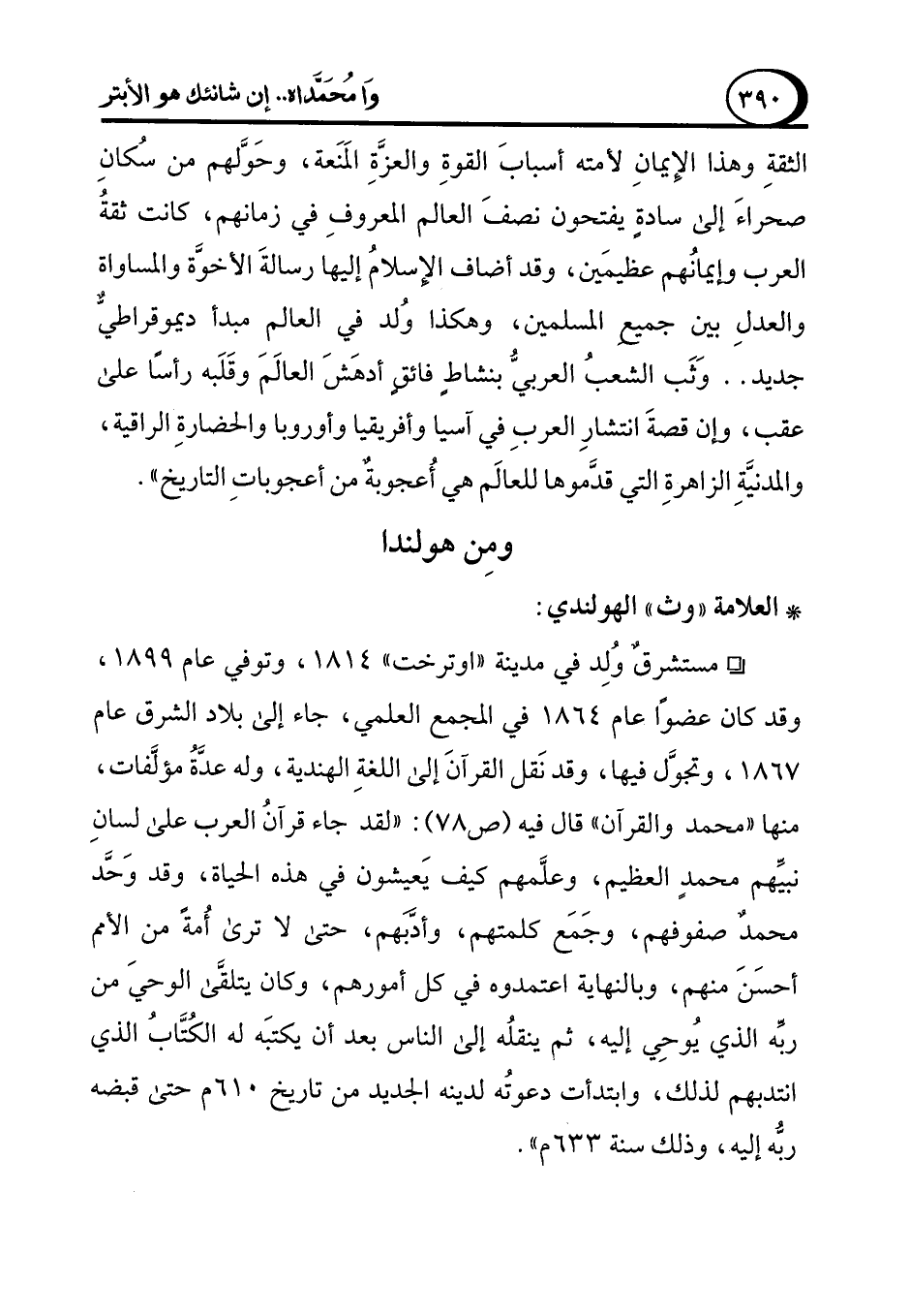 ° مستشرقٌ وُلِد في مدينة "اوترخت" 1814، وتوفي عام 1899، وقد كان عضوًا عام 1864 في المجمع العلمي، جاء إلى بلاد الشرق عام 1867، وتجوَّل فيها، وقد نَقل القرآنَ إلى اللغةِ الهندية، وله عدَّةُ مؤلَّفات، منها "محمد والقرآن" قال فيه (ص 78): "لقد جاء قرآنُ العرب على لسانِ نبيِّهم محمدٍ العظيم، وعلَّمهم كيف يَعيشون في هذه الحياة، وقد وَحَّد محمد صفوفهم، وجَمَع كلمتهم، وأدَّبهم، حتى لا ترى أُمةً من الأمم أحسَنَ منهم، وبالنهاية اعتمدوه في كل أمورهم، وكان يتلقَّى الوحيَ من ربِّه الذي يُوحِي إليه، ثم ينقلُه إلى الناس بعد أن يكتبَه له الكُتَّابُ الذي انتدبهم لذلك، وابتدأت دعوتُه لدينه الجديد من تاريخ 610 م حتى قبضه ربُّه إليه، وذلك سنة 633 م".