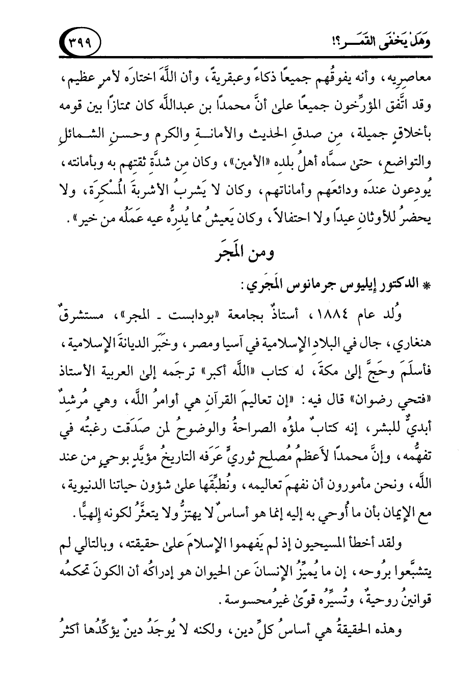 ولقد أخطأ المسيحيون إذ لم يَفهموا الإسلامَ على حقيقته، وبالتالي لم يتشبَّعوا برُوحه، إن ما يمُيِّزُ الإِنسانَ عن الحيوان هو إدراكُه أن الكونَ تحكمُه قوانينُ روحيةٌ، وتسيِّرُه قوًى غيرُ محسوسة.