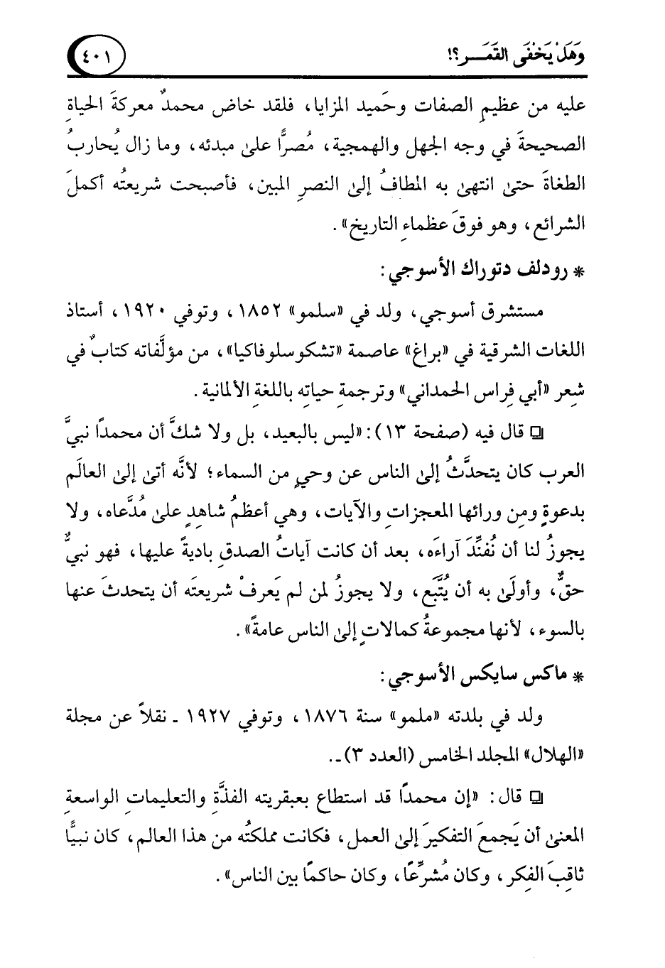 ° قال فيه (صفحة 13): "ليس بالبعيد، بل ولا شكَّ أن محمدًا نبيَّ العرب كان يتحدَّثُ إلى الناس عن وحيٍ من السماء؛ لأنَّه أتى إلى العالَم بدعوةٍ ومِن ورائها المعجزاتِ والآيات، وهي أعظمُ شاهِدٍ على مُدَّعاه، ولا يجوزُ لنا أن نُفنِّدَ آراءَه، بعد أن كانت آياتُ الصدقِ باديةً عليها، فهو نبيٌّ حقٌّ، وأولَى به أن يُتَّبَع، ولا يجوزُ لمن لم يَعرفْ شريعتَه أن يتحدثَ عنها بالسوء، لأنها مجموعةُ كمالاتٍ إلى الناس عامةً".