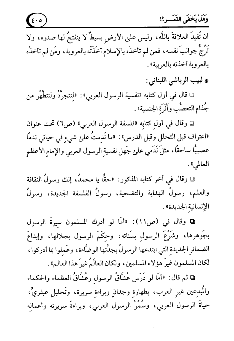 ° وقال في (ص 11): "أمَا لو أدرك المسلمون سِيرةَ الرسول بجَوهرها، وشَرْعَ الرسولِ بسَنائه، وحِكَمَ الرسول بجلالها، وإبداعَ الضمائرِ الجديدةِ التي ابتدعها الرسولُ بجدَّتها الوضَّاءة، وعَمِلوا بما أدركوا، لكان المسلمون غيرَ هؤلاء المسلمين، ولكان العالَمُ غيرَ هذا العالم".