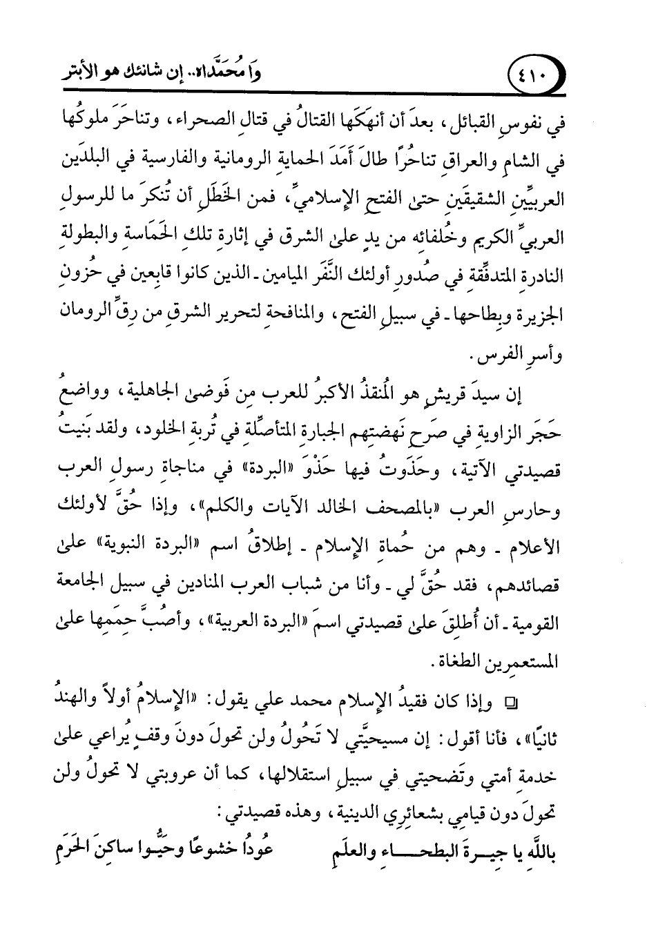 إن سيدَ قريشٍ هو المُنقذُ الأكبرُ للعرب مِن فَوضى الجاهلية، وواضعُ حَجَر الزاويةِ في صَرحِ نَهضتِهم الجبارةِ المتأصِّلةِ في تُربةِ الخلود، ولقد بَنيتُ قصيدتي الآتية، وحَذَوتُ فيها حَذْوَ "البردة" في مناجاةِ رسولِ العرب وحارسِ العرب "بالمصحف الخالد الآيات والكلم"، وإذا حُقَّ لأولئك الأعلام -وهم من حُماةِ الإِسلام- إطلاقُ اسم "البردة النبوية" على قصائدهم، فقد حُقَّ لي -وأنا من شباب العرب المنادين في سبيل الجامعة القومية- أن أُطلِقَ على قصيدتي اسمَ "البردة العربية"، وأصُبَّ حِمَمِها على المستعمِرين الطغاة.