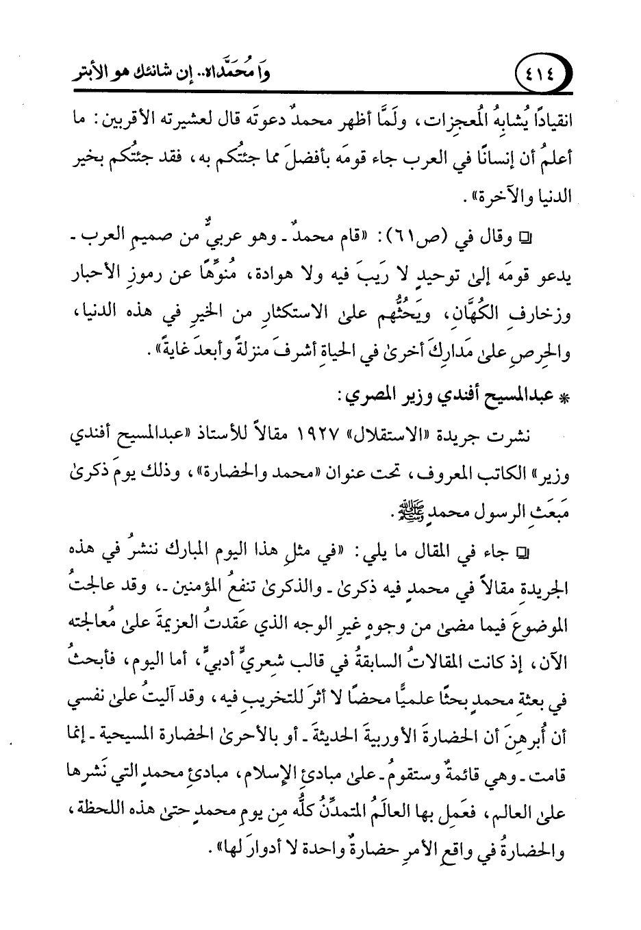 ° وقال في (ص61): "قام محمدٌ -وهو عربيٌّ من صميمِ العرب- يدعو قومَه إلى توحيدٍ لا رَيبَ فيه ولا هوادة، مُنوِّهًا عن رموزِ الأحبار وزخارفِ الكُهَّانِ، وَيحُثُّهم على الاستكثارِ من الخيرِ في هذه الدنيا، والحِرصِ على مَدارِكَ أخرى في الحياةِ أشرفَ منزلةً وأبعدَ غايةً".
