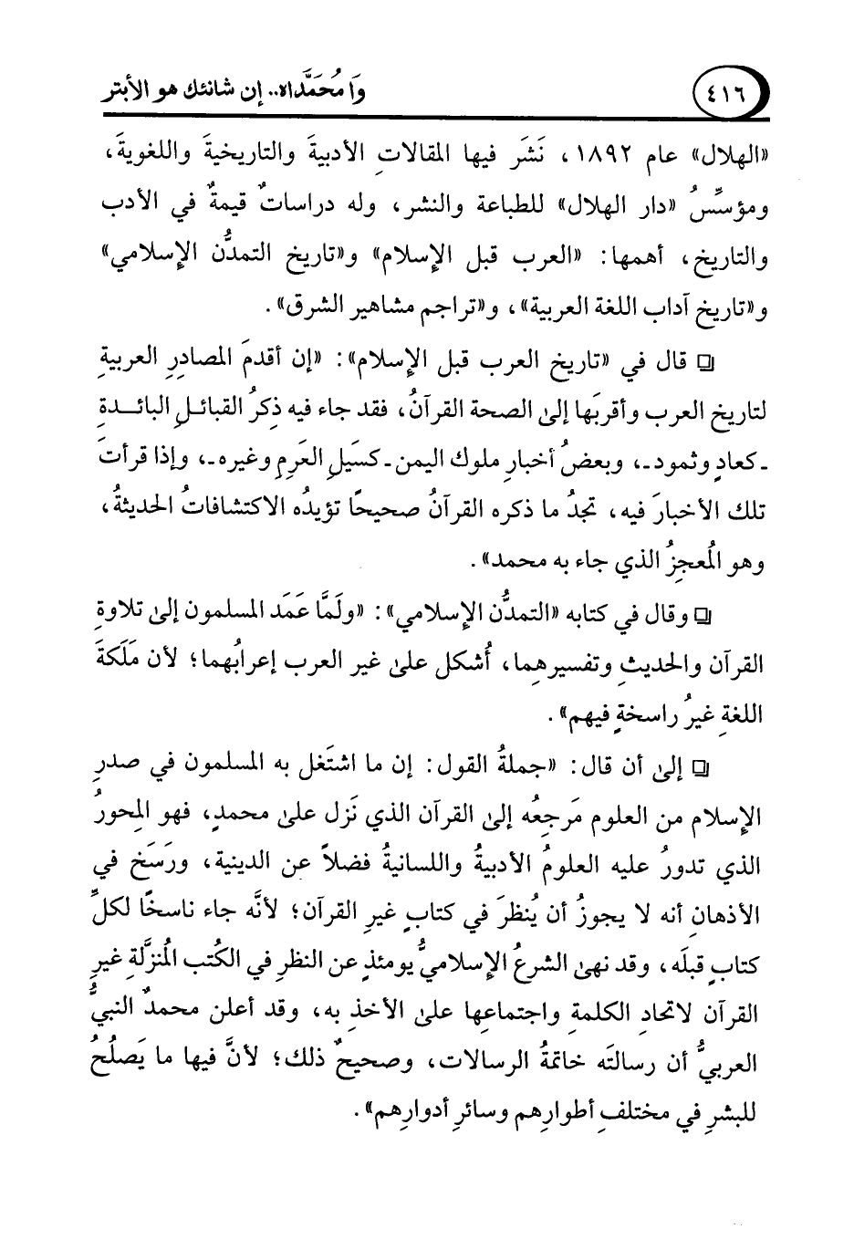 ° إلى أن قال: "جملةُ القول: إن ما اشتَغل به المسلمون في صدرِ الإسلام من العلوم مَرجِعُه إلى القرآن الذي نَزل على محمدٍ، فهو المِحورُ الذي تدورُ عليه العلومُ الأدبيةُ واللسانيةُ فضلاً عن الدينية، ورَسَخ في الأذهانِ أنه لا يجوزُ أن يُنظرَ في كتابٍ غيرِ القرآن؛ لأنَّه جاء ناسخًا لكلِّ كتابٍ قبلَه، وقد نهى الشرعُ الإسلاميُّ يومئذٍ عن النظرِ في الكُتب المُنزَّلةِ غيرِ القرآن لاتحادِ الكلمةِ واجتماعِها على الأخذِ به، وقد أعلن محمدٌ النبي العربيُّ أن رسالتَه خاتمةُ الرسالات، وصحيحٌ ذلك؛ لأنَّ فيها ما يَصلُحُ للبشرِ في مختلفِ أطوارِهم وسائرِ أدوارِهم".