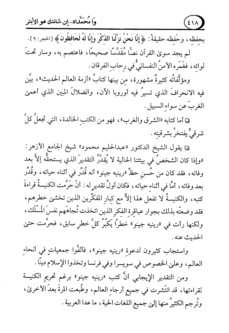 ° يقول الشيخ الدكتور "عبد الحليم محمود" شيخ الجامع الأزهر: "وإذا كان الشخصُ في بيئتنا الحالية لا يُقدَّرُ التقديرَ الذي يستحقُّه إلاَّ بعد وفاته، فقد كان من حُسنِ حظِّ "رينيه جينو" أنه قُدِّر في أثناء حياته، وقُدِّر بعد وفاته، أمَّا في أثناءِ حياته، فكان أولُ تقديرٍ له: أنْ حَرَّمت الكنيسةُ قراءةَ كتبه، والكنيسةُ لا تفعل هذا إلاَّ مع كِبارِ المفكِّرين الذين تخشى خطرهم، فقد وضعتْه بذلك بجوار عباقِرةِ الفِكرِ الذين اتخذت تُجاهَهم نفسَ المَسْلَك، ولكنها رأت في "رينيه جينو" خطرًا يَكبُرُ كلَّ خطرٍ سابق، فحرَّمت حتى الحديث عنه.
