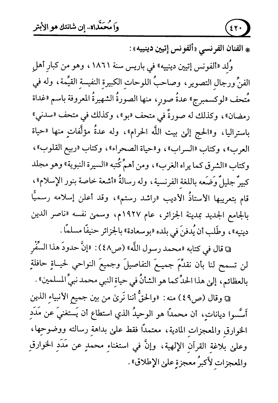 ° وقال (ص 49) منه: "والحقُّ أننا نَرى من بين جميِع الأنبياءِ الذين أَسَّسوا دياناتٍ، أن محمدًا هو الوحيدُ الذي استطاع أن يستغنيَ عن مَدَدِ الخوارقِ والمعجزاتِ المادية، معتمدًا فقط على بداهةِ رسالته ووضوحِها، وعلى بلاغةِ القرآنِ الإلهية، وإنَّ في استغناءِ محمدٍ عن مَدَدِ الخوارقِ والمعجزاتِ لأَكبرُ معجزةٍ على الإطلاق".