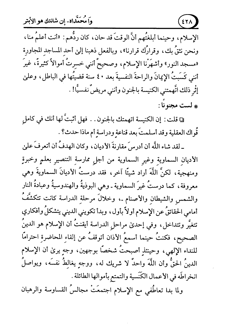 ° قلت: إن الكنيسة اتهمتك بالجنون .. فهل أثبتَّ لها أنك في كاملِ قُواك العقلية وقد أسلمتَ بعد قناعةٍ ودراسةٍ أم ماذا حدث؟.