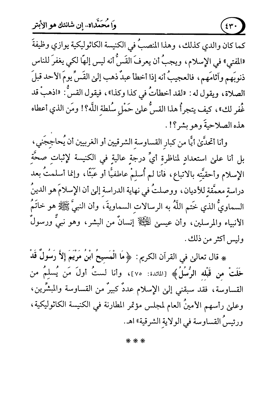 * قال تعالى في القرآن الكريم: {مَا الْمَسِيحُ ابْنُ مَرْيَمَ إِلَّا رَسُولٌ قَدْ خَلَتْ مِنْ قَبْلِهِ الرُّسُلُ} [المائدة: 75]، وأنا لستُ أولَ مَن يُسلِمُ من القساوسة، فقد سبقني إلى الإِسلام عدد كبير من القساوسة والمبشِّرين، وعلى رأسهم الأمينُ العام لمجلس مؤتمر المطارنة في الكنيسة الكاثوليكية، ورئيسُ القساوسة في الولايةِ الشرقية" اهـ.