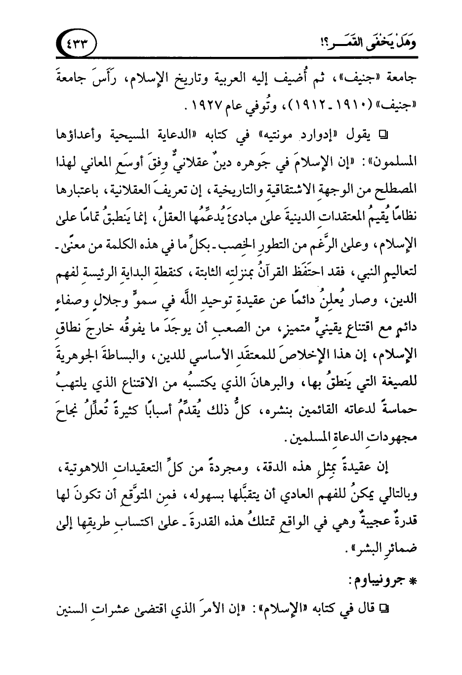 ° يقول "إدوارد مونتيه" في كتابه "الدعاية المسيحية وأعداؤها المسلمون": "إن الإسلامَ في جَوهره دينٌ عقلانيٌّ وِفقَ أوسَعِ المعاني لهذا المصطلح من الوجهةِ الاشتقاقيةِ والتاريخية، إن تعريفَ العقلانية، باعتبارها نظامًا يُقيمُ المعتقداتِ الدينيةَ على مبادئَ يُدعِّمُها العقلُ، إنما يَنطبقُ تمامًا على الإسلام، وعلى الرَّغم من التطورِ الخِصب -بكلِّ ما في هذه الكلمة من معنًى- لتعاليم النبي، فقد احتَفَظ القرآنُ بمنزلتِه الثابتة، كنقطةِ البدايةِ الرئيسةِ لفهم الدين، وصار يُعلِنُ دائمًا عن عقيدةِ توحيدِ الله في سموٍّ وجلالٍ وصفاءٍ دائمٍ مع اقتناعٍ يقينيٍّ متميزٍ، من الصعبِ أن يوجَدَ ما يفوقُه خارجَ نطاقِ الإسلام، إن هذا الإخلاصَ للمعتقَدِ الأساسي للدين، والبساطةَ الجوهريةَ للصيغة التي يَنطقُ بها، والبرهانَ الذي يكتسبُه من الاقتناع الذي يلتهبُ حماسةً لدعاته القائمين بنشره، كلُّ ذلك يُقدِّمُ أسبابًا كثيرةً تُعلِّلُ نجاحَ مجهوداتِ الدعاةِ المسلمين.