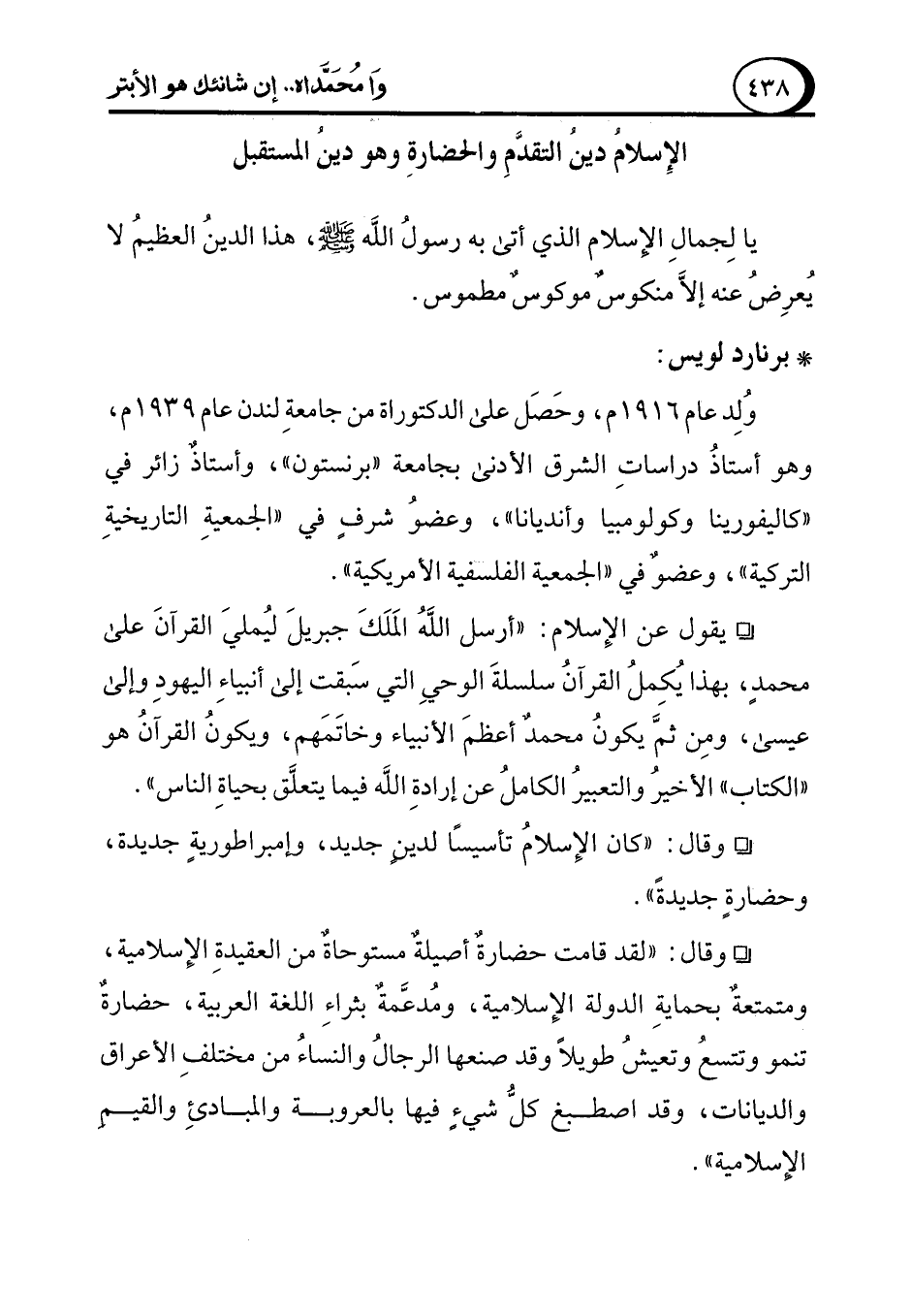 ° يقول عن الإِسلام: "أرسل اللهُ المَلَكَ جبريلَ ليُمليَ القرآنَ على محمدٍ، بهذا يُكِملُ القرآنُ سلسلةَ الوحيِ التى سَبقت إلى أنبياءِ اليهودِ وإلى عيسى، ومِن ثمَّ يكونُ محمد أعظمَ الأنبياء وخاتَمَهم، ويكونُ القرآنُ هو "الكتاب" الأخيرُ والتعبيرُ الكاملُ عن إرادةِ الله فيما يتعلَّق بحياةِ الناس".