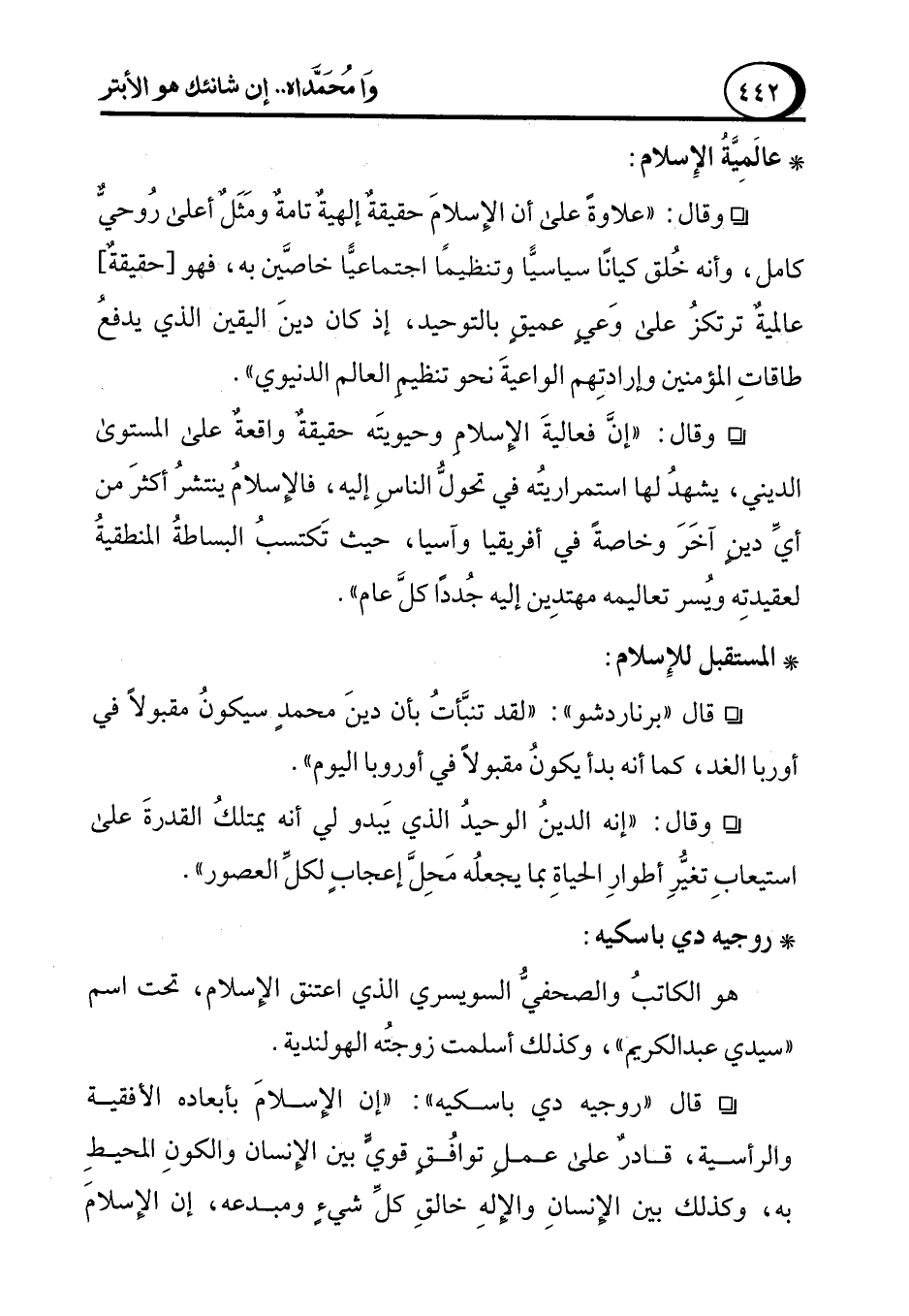 ° قال "برناردشو": "لقد تنبَّأتُ بأن دينَ محمدٍ سيكونُ مقبولاً في أوربا الغد، كما أنه بدأ يكونُ مقبولاً في أوروبا اليوم".