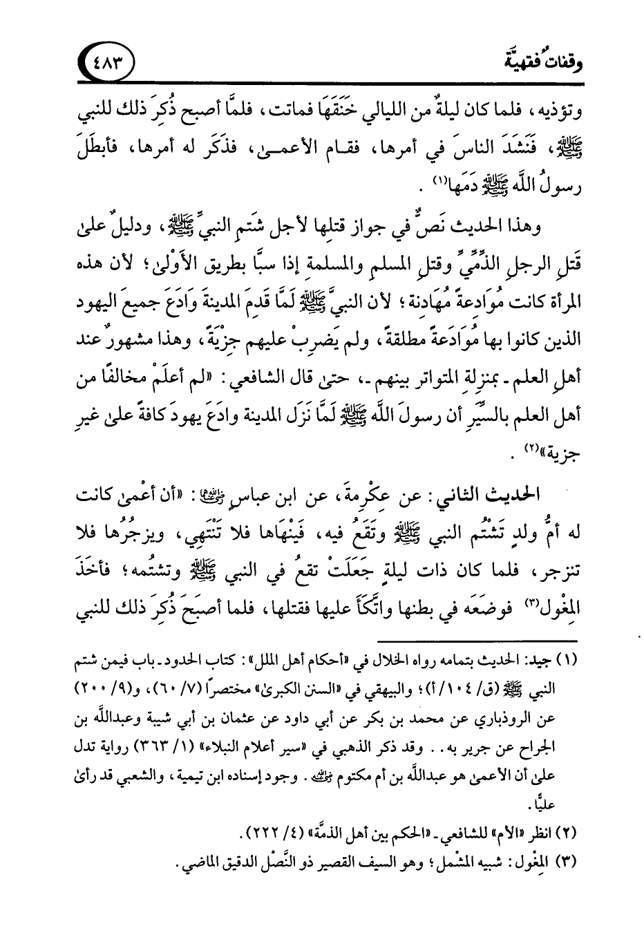 الحديث الثاني: عن عِكْرِمةَ، عن ابن عباسٍ - رضي الله عنهما -: "أن أعْمى كانت له أمُّ ولدٍ تَشْتُم النبي - صلى الله عليه وسلم - وتَقَعُ فيه، فَينْهَاها فلا تَنْتَهِي، ويزجُرُها فلا تنزجر، فلما كان ذات ليلةٍ جَعَلَتْ تقعُ في النبي - صلى الله عليه وسلم - وتشتُمه؛ فأخَذَ المِغْول (¬3) فوضَعَه في بطنها واتَّكَأَ عليها فقتلها، فلما أصبَحَ ذُكِرَ ذلك للنبي