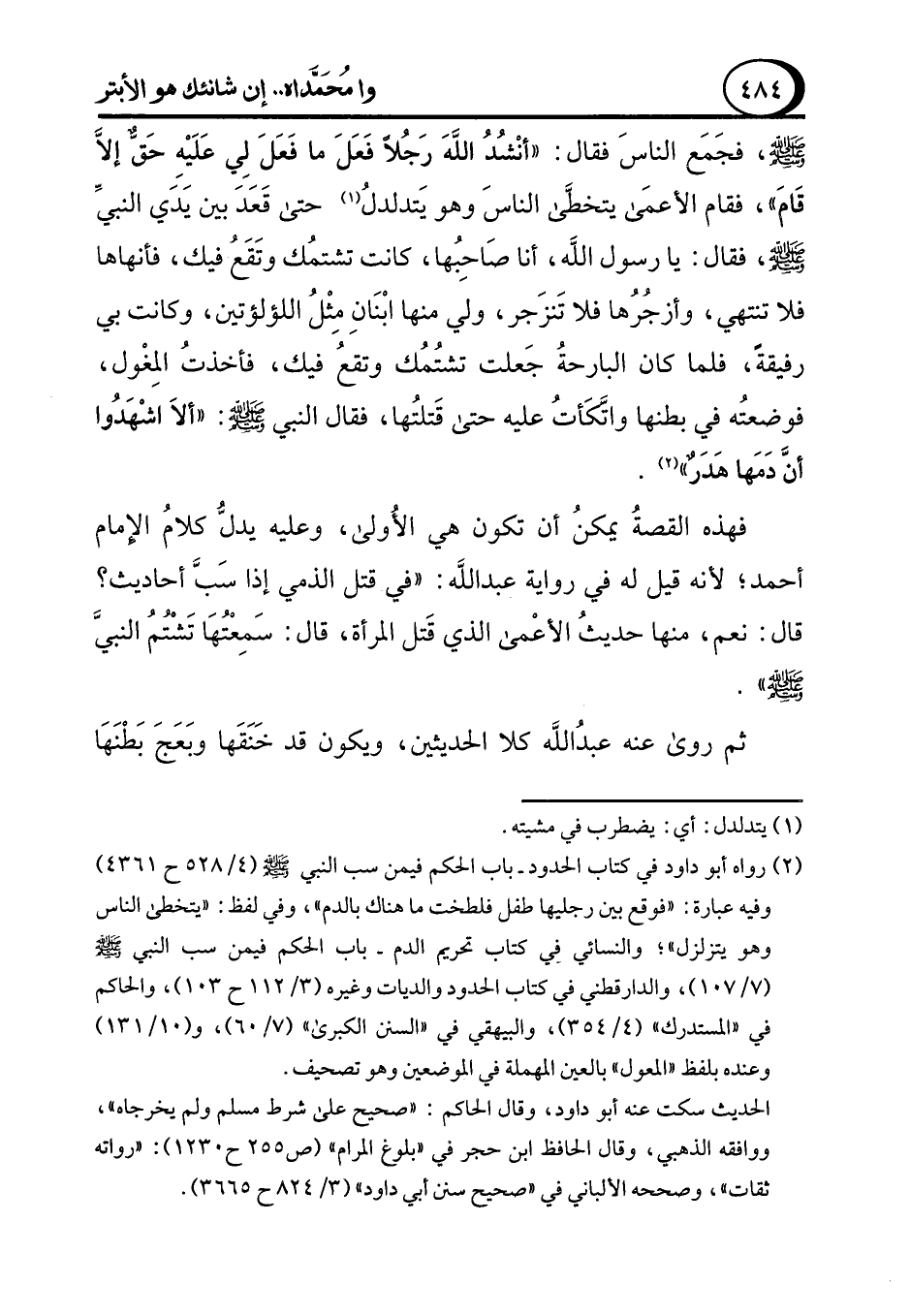 (¬2) رواه أبو داود في كتاب الحدود -باب الحكم فيمن سب النبي - صلى الله عليه وسلم - (4/ 528 ح 4361) وفيه عبارة: "فوقع بين رجليها طفل فلطخت ما هناك بالدم"، وفي لفظ: "يتخطى الناس وهو يتزلزل"؛ والنسائي في كتاب تحريم الدم -باب الحكم فيمن سب النبي - صلى الله عليه وسلم - (7/ 107)، والدارقطني في كتاب الحدود والديات وغيره (3/ 112 ح 103)، والحاكم في "المستدرك" (4/ 354)، والبيهقي في "السنن الكبرى" (7/ 60)، و (10/ 131) وعنده بلفظ "المعول" بالعين المهملة في الموضعين وهو تصحيف.