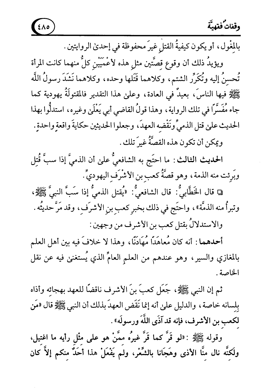 الحديث الثالث: ما احتَج به الشافعي على أن الذميَّ إذا سبَّ قُتِل وبَرِئت منه الذمة، وهو قصَّةُ كعبِ بن الأشْرَفِ اليهوديِّ.