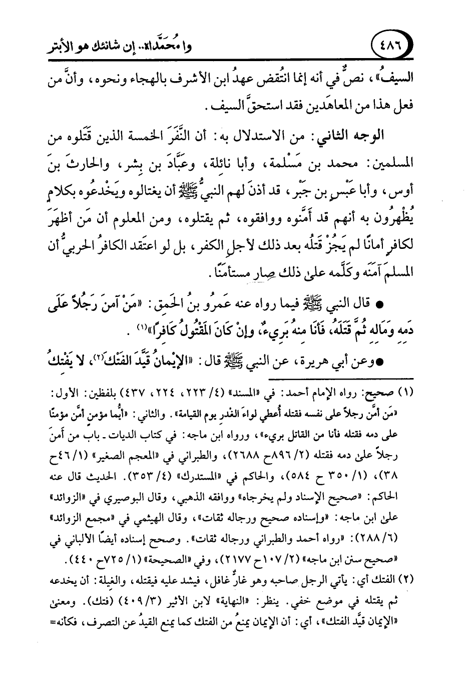 السيفُ"، نصٌّ أنه إنما انتُقض عهدُ ابن الأشرف بالهجاء ونحوه، وأنَّ من فعل هذا من المعاهَدين فقد استحقَّ السيف.