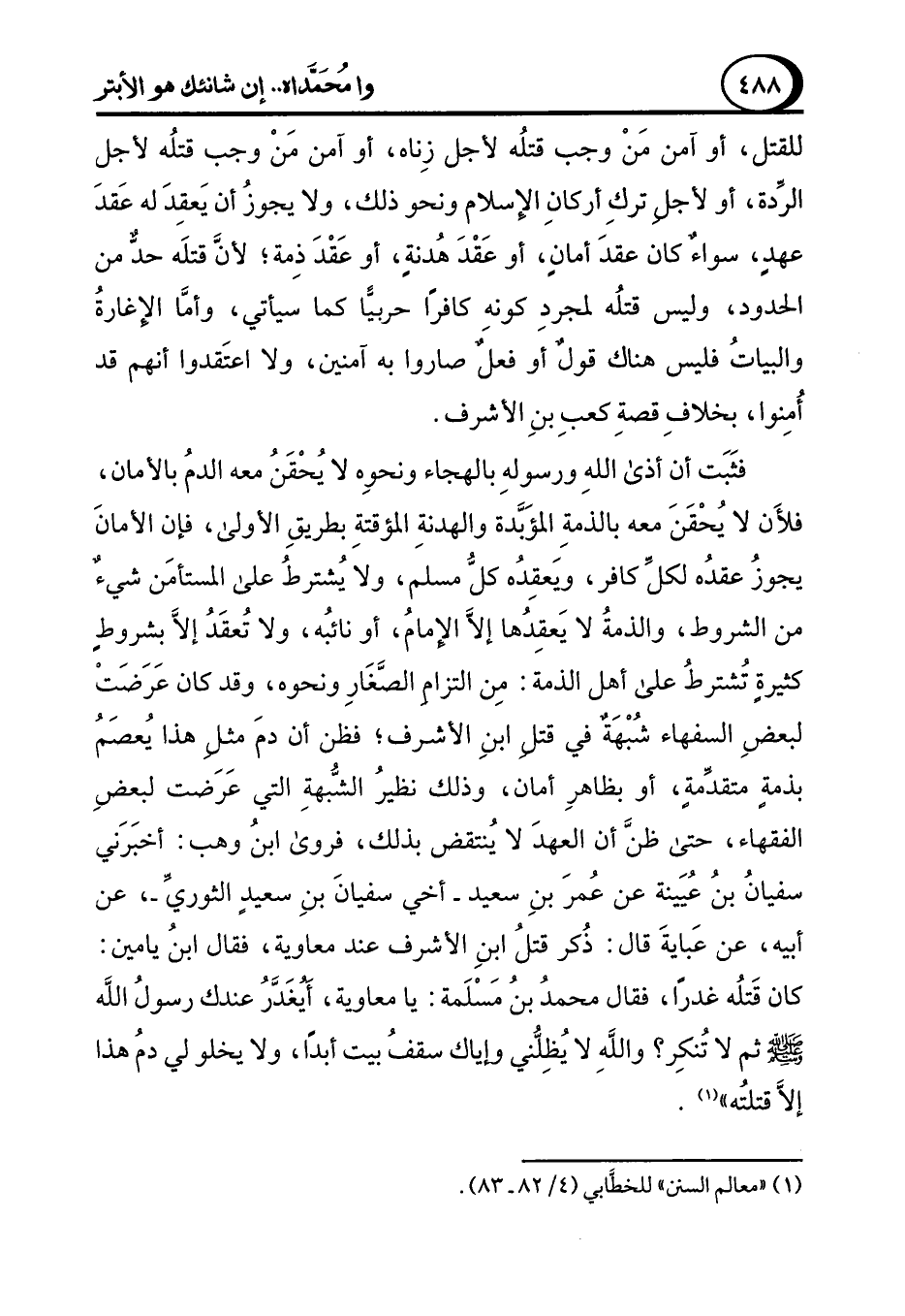 فثَبَت أن أذى اللهِ ورسولهِ بالهجاء ونحوِه لا يُحْقَنُ معه الدمُ بالأمان، فلأَن لا يُحْقَنَ معه بالذمةِ المؤَبَّدة والهدنةِ المؤقتةِ بطريقِ الأولى، فإن الأمانَ يجوزُ عقدُه لكلِّ كافر، ويَعقِدُه كلُّ مسلم، ولا يُشترطُ على المستأمَن شيءٌ من الشروط، والذمةُ لا يَعقِدُها إلاَّ الإمامُ، أو نائبُه، ولا تُعقَدُ إلاَّ بشروطٍ كثيرةٍ تُشترطُ على أهل الذمة: مِن التزامِ الصَّغَارِ ونحوه، وقد كان عَرَضَتْ لبعضِ السفهاء شُبْهَةٌ في قتلِ ابنِ الأشرف؛ فظن أن دمَ مثلِ هذا يُعصَمُ بذمةٍ متقدِّمةٍ، أو بظاهرِ أمان، وذلك نظيرُ الشُّبهةِ التي عَرَضت لبعضِ الفقهاء، حتى ظنَّ أن العهدَ لا يُنتقض بذلك، فروى ابنُ وهب: أخبَرَني سفيانُ بنُ عُيَينة عن عُمرَ بنِ سعيد -أخي سفيانَ بنِ سعيدٍ الثوريِّ-، عن أبيه، عن عَبايةَ قال: ذُكر قتلُ ابنِ الأشرف عند معاوية، فقال ابنُ يامين: كان قَتلُه غدرًا، فقال محمدُ بنُ مَسْلَمة: يا معاوية، أيُغَدَّرُ عندك رسولُ الله - صلى الله عليه وسلم - ثم لا تُنكِر؟ واللهِ لا يُظِلُّني وإياك سقفُ بيت أبدًا، ولا يخلو لي دمُ هذا إلاَّ قتلتُه" (¬1).