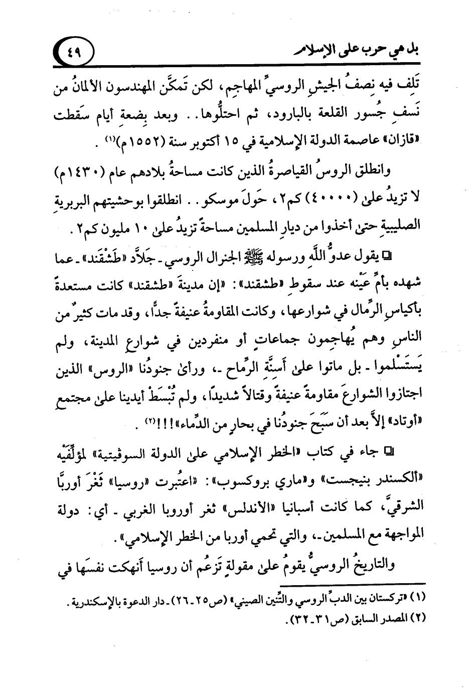° جاء في كتاب "الخطر الإسلامي على الدولة السوفيتية" لمؤلِّفَيْه "ألكسندر بنيجست" و"ماري بروكسوب": "اعتُبرت روسيا" ثَغْرَ أوربا الشرقي، كما كانت أسبانيا "الأندلس" ثغر أوروبا الغربي -أي: دولة المواجهة مع المسلمين-، والتي تحمي أوربا من الخطر الإسلامي".