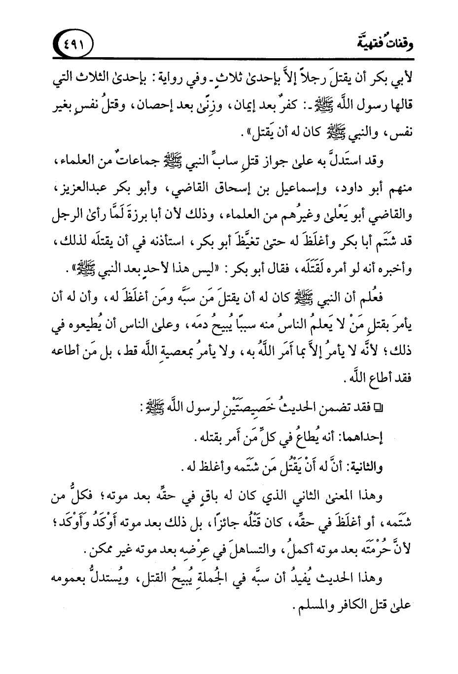 لأبي بكر أن يقتلَ رجلاً إلاَّ بإحدى ثلاثٍ -وفي رواية: بإحدى الثلاث التي قالها رسول الله - صلى الله عليه وسلم -: كفرٌ بعد إيمان، وزِنًى بعد إحصان، وقتلُ نفسٍ بغير نفس، والنبي- صلى الله عليه وسلم - كان له أن يَقتل".