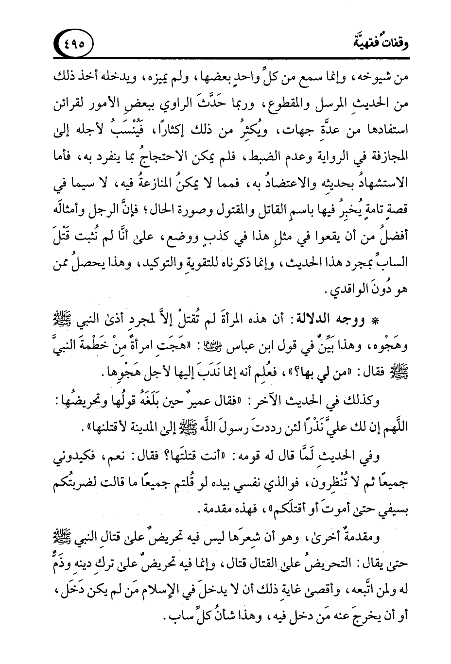 من شيوخه، وإنما سمع من كلِّ واحدٍ بعضها، ولم يميزه، ويدخله أخذ ذلك من الحديثِ المرسل والمقطوع، وربما حَدَّثَ الراوي ببعضِ الأمور لقرائن استفادها من عدَّةِ جهات، ويُكثِرُ من ذلك إكثارًا، فيُنْسَبُ لأجله إلى المجازفة في الرواية وعدم الضبط، فلم يمكن الاحتجاجُ بما ينفرد به، فأما الاستشهادُ بحديثِه والاعتضادُ به، فمما لا يمكنُ المنازعة فيه، لا سيما في قصةٍ تامةٍ يُخبِرُ فيها باسمِ القاتل والمقتول وصورة الحال؛ فإنَّ الرجل وأمثالَه أفضلُ من أن يقعوا في مثلِ هذا في كذبٍ ووضع، على أنَّا لم نُثبت قَتْلَ السابِّ بمجرد هذا الحديث، وإنما ذكرناه للتقويةِ والتوكيد، وهذا يحصلُ ممن هو دُونَ الواقدي.