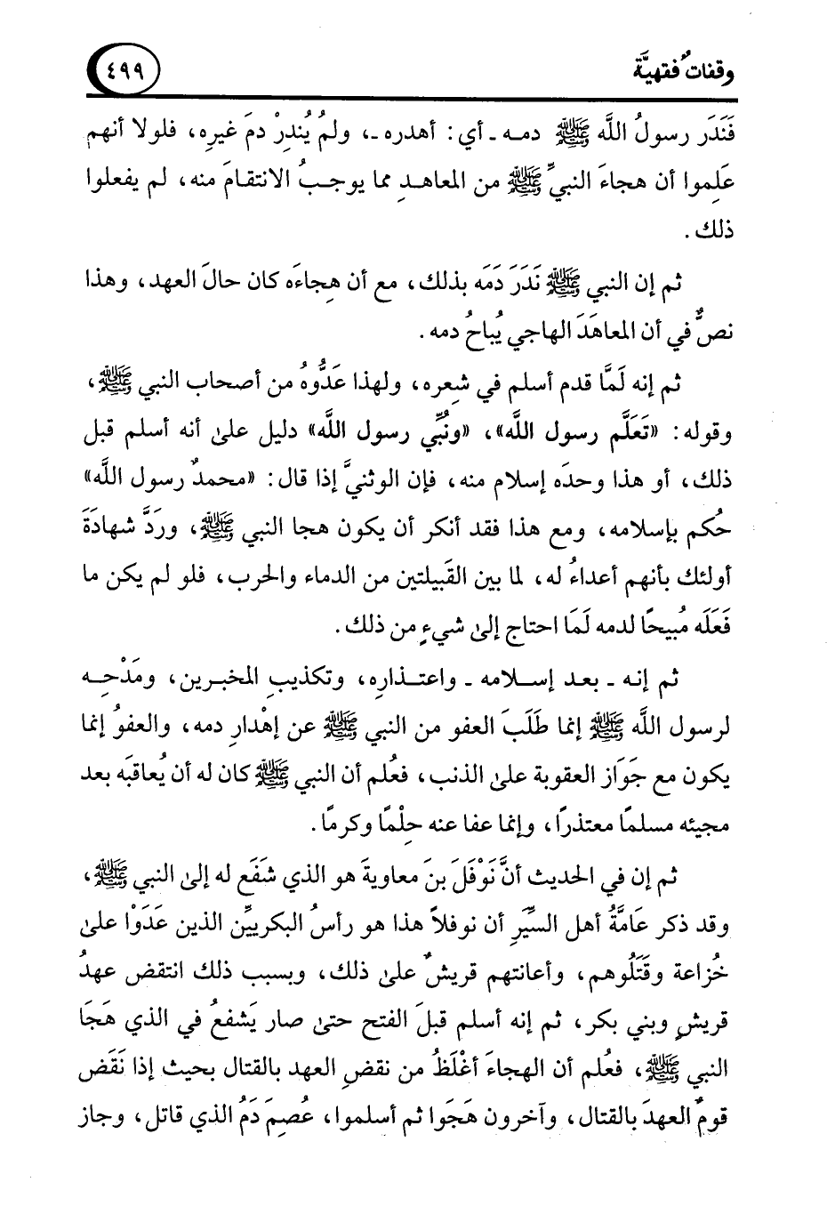 ثم إن في الحديث أنَّ نَوْفَلَ بنَ معاويةَ هو الذي شَفَع له إلى النبي - صلى الله عليه وسلم -، وقد ذكر عَامَّةُ أهل السَّيرِ أن نوفلاً هذا هو رأسُ البكرييِّن الذين عَدَوْا على خُزاعة وقَتَلُوهم، وأعانتهم قريشٌ على ذلك، وبسبب ذلك انتقض عهدُ قريش وبني بكر، ثم إنه أسلم قبلَ الفتح حتى صار يَشفعُ في الذي هَجَا النبي - صلى الله عليه وسلم -، فعُلم أن الهجاءَ أغْلَظُ من نقضِ العهد بالقتال بحيث إذا نَقَض قومٌ العهدَ بالقتال، وآخرون هَجَوا ثم أسلموا، عُصِمَ دَمُ الذي قاتل، وجاز