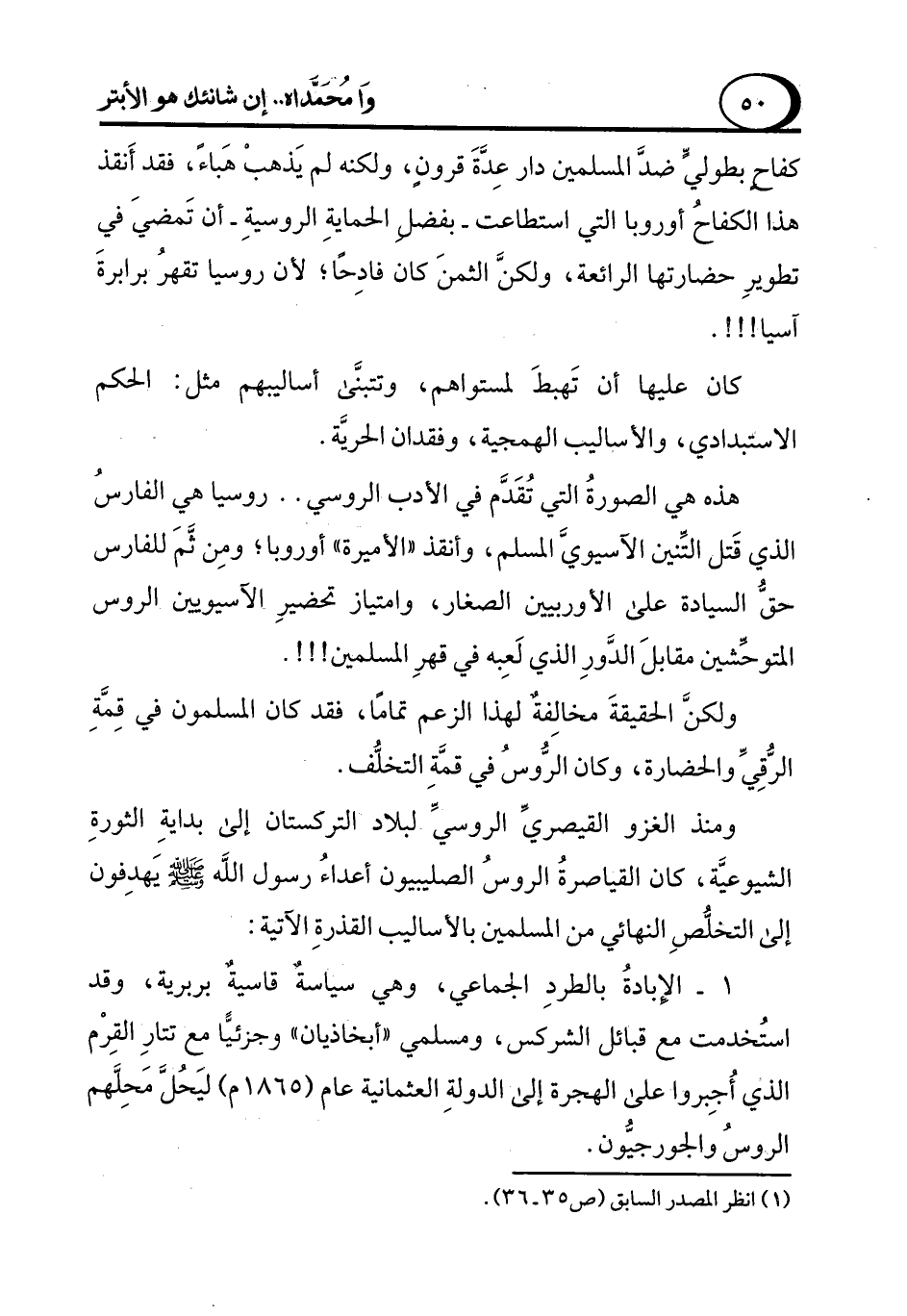 كفاح بطوليٍّ ضدَّ المسلمين دار عِدَّةَ قرونٍ، ولكنه لم يَذهبْ هَباءً، فقد أَنقذ هذا الكفاحُ أوروبا التي استطاعت -بفضل الحمايةِ الروسيةِ- أن تَمضيَ في تطويرِ حضارتها الرائعة، ولكنَّ الثمنَ كان فادِحًا، لأن روسيا تقهرُ برابرةَ آسيا!!!.