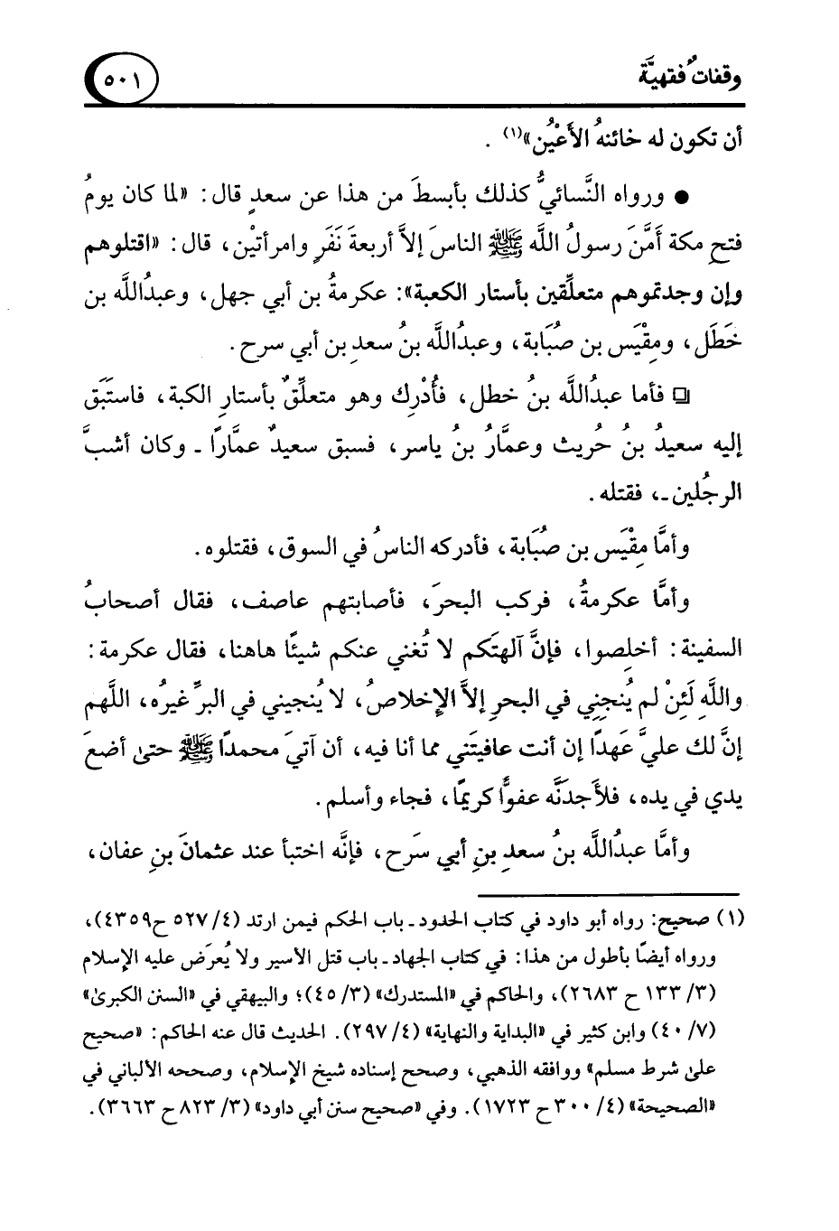 • ورواه النَّسائىُّ كذلك بأبسطَ من هذا عن سعدٍ قال: "لما كان يومُ فتح مكة أَمَّنَ رسولُ الله - صلى الله عليه وسلم - الناسَ إلاَّ أربعةَ نَفَرٍ وامرأتيْن، قال: "اقتلوهم وإن وجدتموهم متعلِّقين بأستار الكعبة": عكرمةُ بن أبي جهل، وعبدُ الله بن خَطَل، ومِقْيَس بن صُبَابة، وعبدُالله بنُ سعدِ بن أبي سرح.