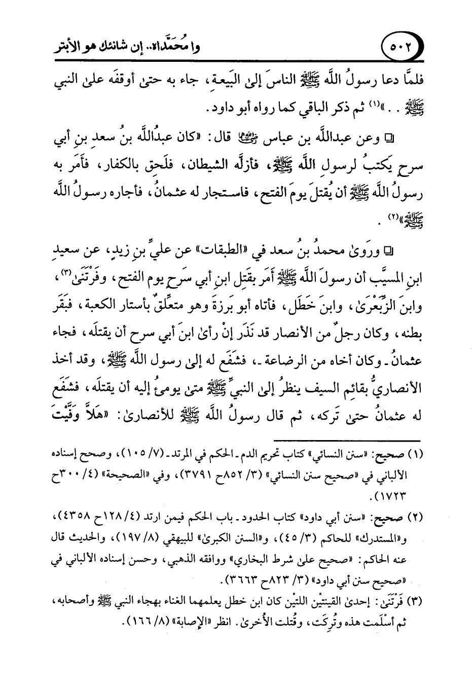 ° وعن عبد الله بن عباس - رضي الله عنهما - قال: "كان عبدُ الله بنُ سعدِ بنِ أبي سرحٍ يَكتبُ لرسولِ الله - صلى الله عليه وسلم -، فأزلَّه الشيطان، فلَحِق بالكفار، فأَمَر به رسولُ الله - صلى الله عليه وسلم - أن يُقتلَ يومَ الفتح، فاستجار له عثمان، فأجاره رسولُ الله - صلى الله عليه وسلم -" (¬2).