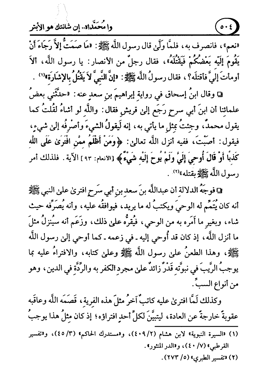° وقال ابنُ إسحاق في روايةِ إبراهيمَ بنِ سعدٍ عنه: "حدَّثني بعضُ علمائِنا أن ابنَ أبي سرحٍ رَجَع إلى قريشٍ فقال: واللهِ لو أشاء لقُلتُ كما يقول محمدٌ، وجِئتُ بمِثل ما يأتي به، إنه لَيقولُ الشيءَ وأصْرِفُه إلى شيءٍ، فيقول: أصَبْتَ، ففيه أنزل الله تعالى: {وَمَنْ أَظْلَمُ مِمَّنِ افْتَرَى عَلَى اللَّهِ كَذِبًا أَوْ قَالَ أُوحِيَ إِلَيَّ وَلَمْ يُوحَ إِلَيْهِ شَيْءٌ} [الأنعام: 93] الآية. فلذلك أمر رسول الله - صلى الله عليه وسلم - بقتله" (¬2).