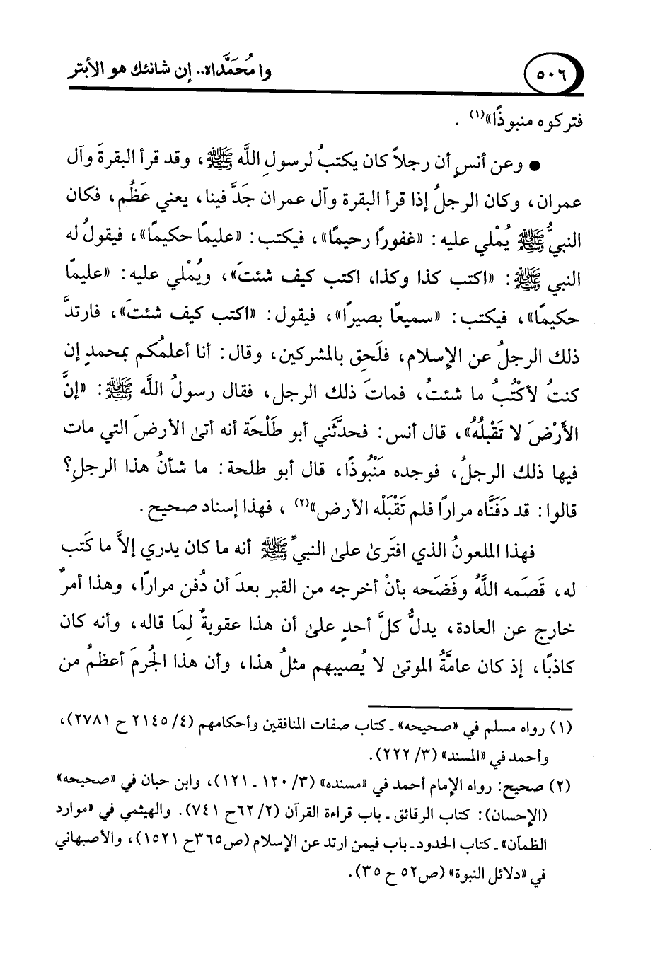 • وعن أنسٍ أن رجلاً كان يكتبُ لرسولِ الله - صلى الله عليه وسلم -، وقد قرأ البقرةَ وآل عمران، وكان الرجلُ إذا قرأ البقرة وآل عمران جَدَّ فينا، يعني عَظُم، فكان النبيُّ - صلى الله عليه وسلم - يُمْلي عليه: "غفورًا رحيمًا"، فيكتب: "عليمًا حكيمًا"، فيقولُ له النبي - صلى الله عليه وسلم -: "اكتب كذا وكذا، اكتب كيف شئتَ"، ويُمْلي عليه: "عليمًا حكيمًا"، فيكتب: "سميعًا بصيرًا"، فيقول: "اكتب كيف شئتَ"، فارتدَّ ذلك الرجلُ عن الإسلام، فلَحِق بالمشركين، وقال: أنا أعلمُكم بمحمدٍ إن كنتُ لأكْتبُ ما شئتُ، فماتَ ذلك الرجل، فقال رسولُ الله - صلى الله عليه وسلم -: "إنَّ الأرْضَ لا تَقْبلُهُ"، قال أنس: فحدَّثَني أبو طَلْحَة أنه أتى الأرضَ التي مات فيها ذلك الرجلُ، فوجده مَنْبُوذًا، قال أبو طلحة: ما شأنُ هذا الرجلِ؟ قالوا: قد دَفَنَّاه مرارًا فلم تَقْبَلْه الأرض" (¬2)، فهذا إسناد صحيح.
