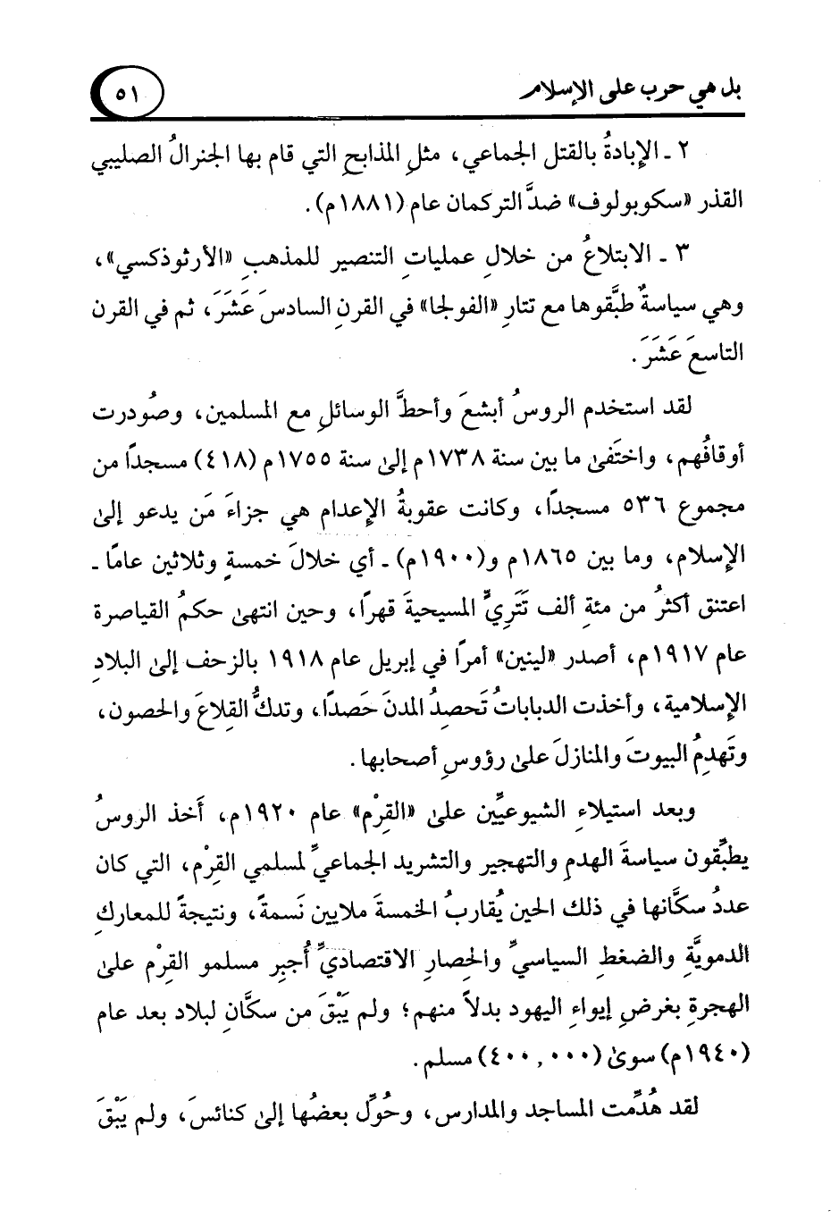 لقد استخدم الروسُ أبشعَ وأحطَّ الوسائل مع المسلمين، وصُودرت أوقافُهم، واختَفى ما بين سنة 1738 م إلى سنة 1755 م (418) مسجدًا من مجموع 536 مسجدًا، وكانت عقوبةُ الإعدام هي جزاءَ مَن يدعو إلى الإسلام، وما بين 1865 م و (1900 م) -أي خلالَ خمسةٍ وثلاثين عامًا- اعتنق أكثرُ من مئةِ ألف تَتَرِيّ المسيحيةَ قهرًا، وحين انتهى حكمُ القياصرة عام 1917 م، أصدر"لينين" أمرًا في إبريل عام 1918 بالزحف إلى البلادِ الإسلامية، وأخذت الدباباتُ تَحصِدُ المدنَ حَصدًا، وتدكُّ القِلاع والحصون، وتَهدِمُ البيوتَ والمنازلَ على رؤوسِ أصحابها.