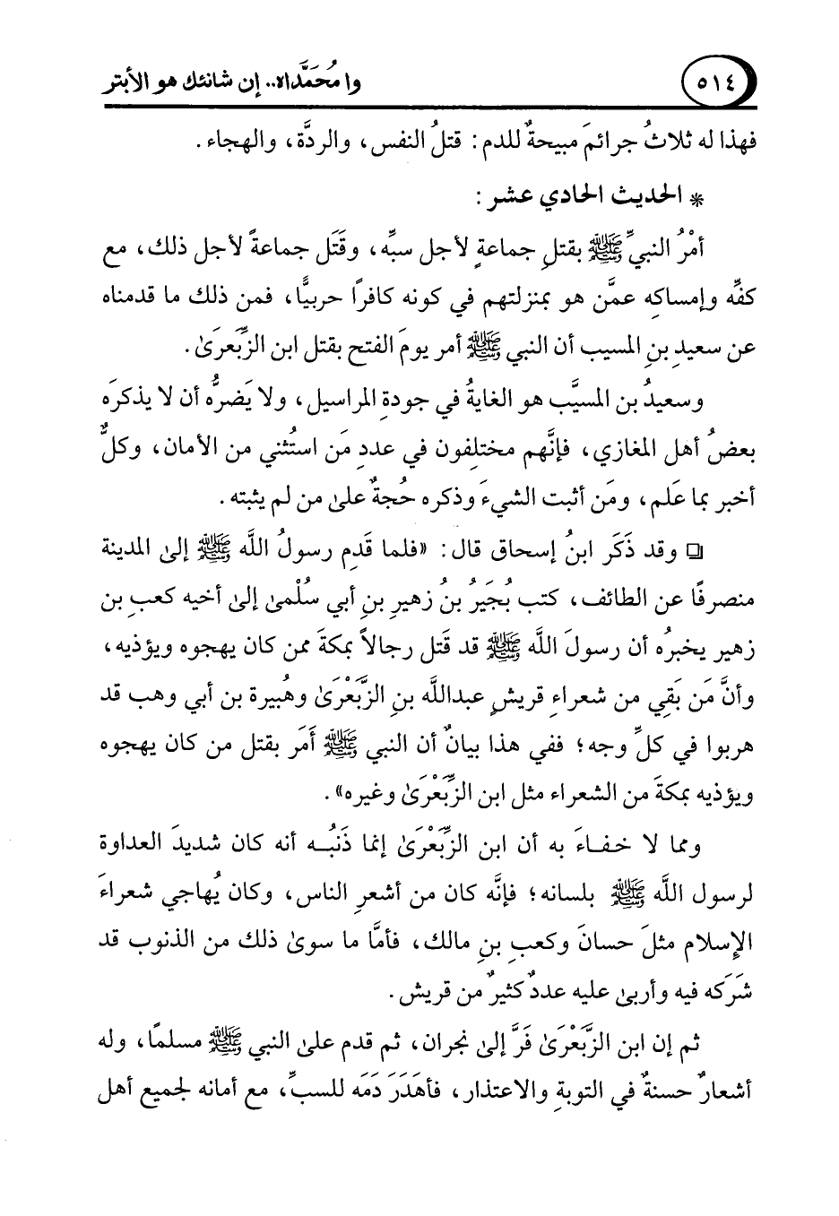 ° وقد ذَكَر ابنُ إسحاق قال: "فلما قَدِم رسولُ الله - صلى الله عليه وسلم - إلى المدينة منصرفًا عن الطائف، كتب بُجَيرُ بنُ زهيرِ بنِ أبي سُلْمى إلى أخيه كعبِ بن زهير يخبرُه أن رسولَ الله - صلى الله عليه وسلم - قد قَتل رجالاً بمكةَ ممن كان يهجوه ويؤذيه، وأنَّ مَن بَقِي من شعراءِ قريش عبد الله بنِ الزَّبعْرَى وهبيرة بن أبي وهب قد هربوا في كلِّ وجه؛ ففي هذا بيانٌ أن النبي - صلى الله عليه وسلم - أَمَر بقتل من كان يهجوه ويؤذيه بمكةَ من الشعراء مثل ابن الزَّبعْرَى وغيره".