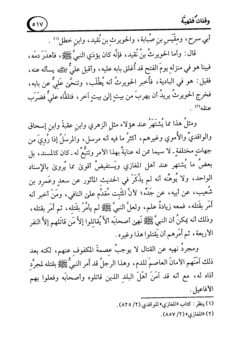 ومثلُ هذا مما يُشتَهَرُ عند هؤلاء مثل الزهري وابنِ عقبةَ وابنِ إسحاق والواقديِّ والأُموي وغيرهم، أكثرُ ما فيه أنه مرسل، والمرسَلُ إذا رُوِيَ من جهاتٍ مختلفةٍ -لا سيما ممن له عنايةٌ بهذا الأمر وتتبُّعٌ له- كان كالمسند، بل بعضُ ما يُشتهر عند أهل المغازي ويَستفيضُ أقوى مما يُروى بالإِسناد الواحد، ولا يُوهِّنه أنه لم يذُكَرْ في الحديثِ المأثور عن سعدٍ وعَمرِو بن شُعيب، عن أبيه، عن جَدِّه، لأن المثْبِت مُقدَّم على النافي، ومَنْ أخبر أنه أَمَر بقَتله، فمعه زيادةُ علم، ولعلَّ النبيَّ - صلى الله عليه وسلم - لم يأمُرْ بقَتلِه، ثم أَمَر بقتله، وذلك أنه يمكنُ أن النبيَّ - صلى الله عليه وسلم - نَهى أصحابَه ألَّا يُقاتِلوا إلاَّ مَن قاتَلهم إلاَّ النفر الأربعة، ثم أَمَرهم أن يَقتلوا هذا وغيره.