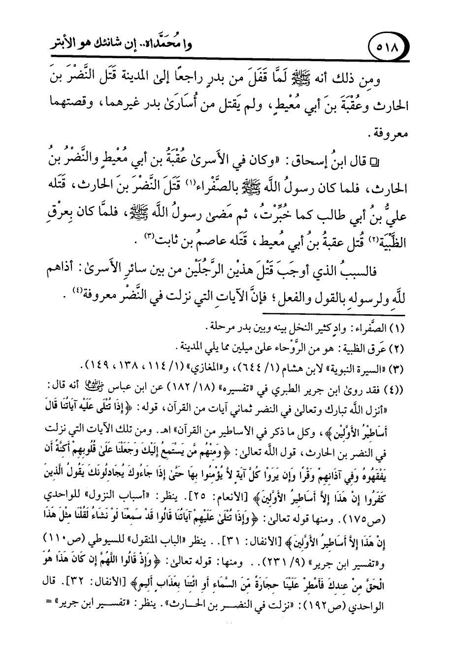 ومِن ذلك أنه - صلى الله عليه وسلم - لَمَّا قَفَلَ من بدرٍ راجعًا إلى المدينة قَتَل النَّضْرَ بنَ الحارث وعُقْبَةَ بنَ أبي مُعْيطٍ، ولم يَقتل من أُسَارَى بدر غيرهما، وقصتهما معروفة.