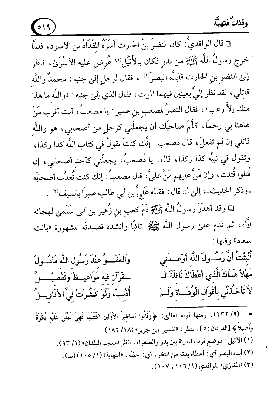 ° قال الواقديُّ: كان النضرُ بنُ الحارث أَسَرَهُ المِقْدَادُ بن الأسود، فلمَّا خرج رسولُ الله - صلى الله عليه وسلم - من بدرٍ فكان بالأُثَيِّل (¬1) عُرِض عليه الأسْرَى، فنظر إلى النضرِ بنِ الحارث فأبدَّه البصرَ (¬2)، فقال لرجلٍ إلى جنبه: محمدٌ واللهِ قاتِلي، لقد نظر إليَّ بعينين فيهما الموت، فقال الذي إلى جنبه: "واللهِ ما هذا منك إلاَّ رعب"، فقال النضرُ لمصعبِ بنِ عمير: يا مصعبُ، أنت أقرب مَنْ ها هنا بي رحمًا، كلمْ صاحبَك أن يجعلَني كرجلٍ من أصحابي، هو واللهِ قاتلي إن لم تفعلْ، قال مصعب: إنَّك كنتَ تقولُ في كتاب الله كذا وكذا، وتقول في نبيَّه كذا وكذا، قال: يا مُصعبُ، يجعلُني كأحدِ أصحابي، إن قُتلوا قُتلت، وإن مَنَّ عليهم مَنَّ عليَّ، قال مصعبٌ: إنك كنت تُعذِّب أصحابَه -وذكر الحديث-، إلى أن قال: فقتله عَلِيُّ بن أبي طالب صبرًا بالسيف (¬3).