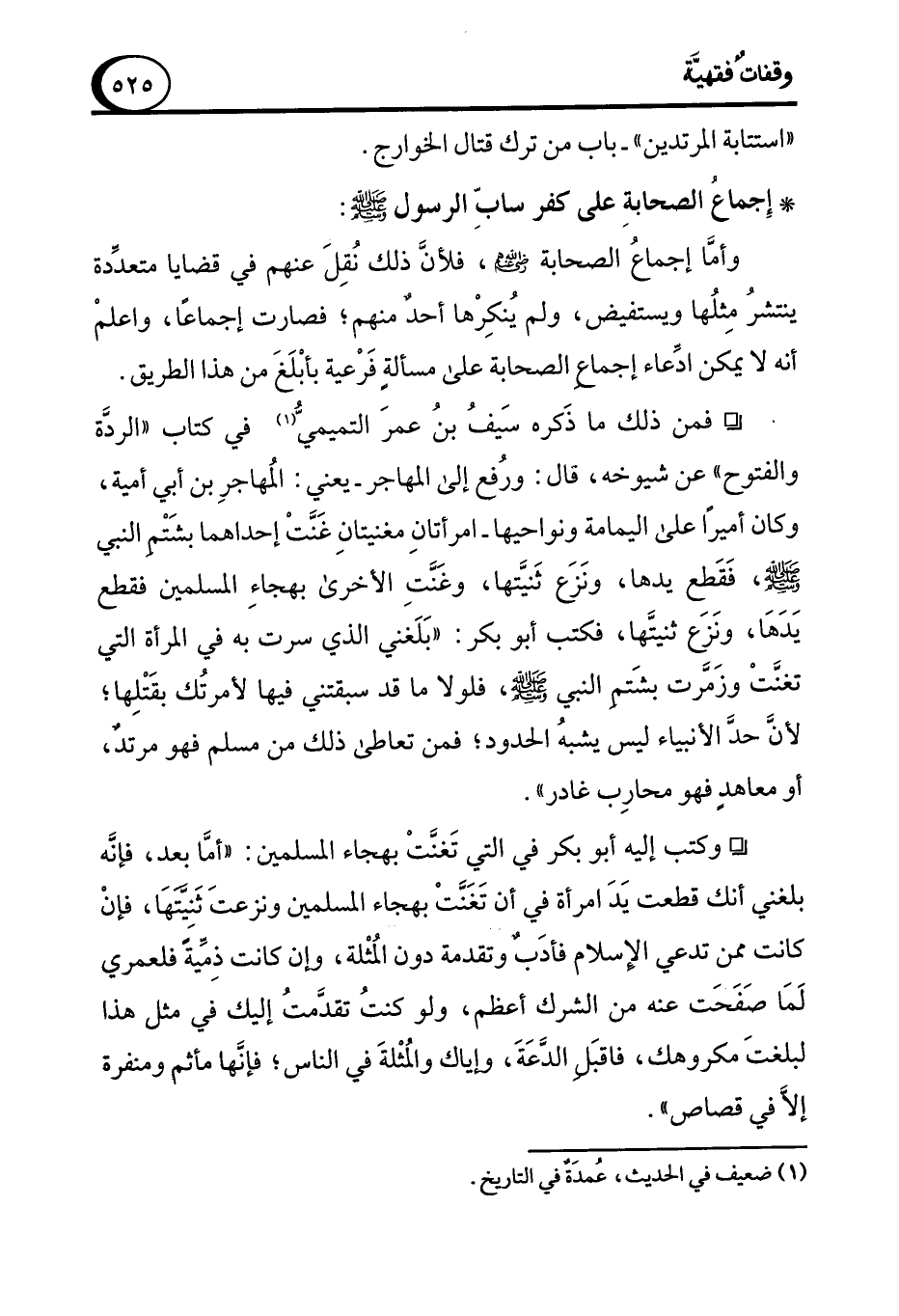 ° فمن ذلك ما ذَكره سَيفُ بنُ عمرَ التميميُّ (¬1) في كتاب "الردَّة والفتوح" عن شيوخه، قال: ورُفع إلى المهاجر -يعني: المُهاجرِ بن أبي أمية، وكان أميرًا على اليمامة ونواحيها- امرأتانِ مغنيتانِ غَنَّتْ إحداهما بشَتْمِ النبي - صلى الله عليه وسلم -، فَقَطع يدها، ونَزعَ ثَنيَّتها، وغَنَّتِ الأخرى بهجاءِ المسلمين فقطع يَدَهَا، ونَزعَ ثنيتَّها، فكتب أبو بكر: "بَلَغني الذي سرت به في المرأة التي تغنَّتْ وزَمَّرت بشَتمِ النبي - صلى الله عليه وسلم -، فلولا ما قد سبقتني فيها لأمرتُك بقَتْلِها؛ لأن حدَّ الأنبياء ليس يشبهُ الحدود؛ فمن تعاطى ذلك من مسلم فهو مرتد، أو معاهدٍ فهو محارِب غادر".