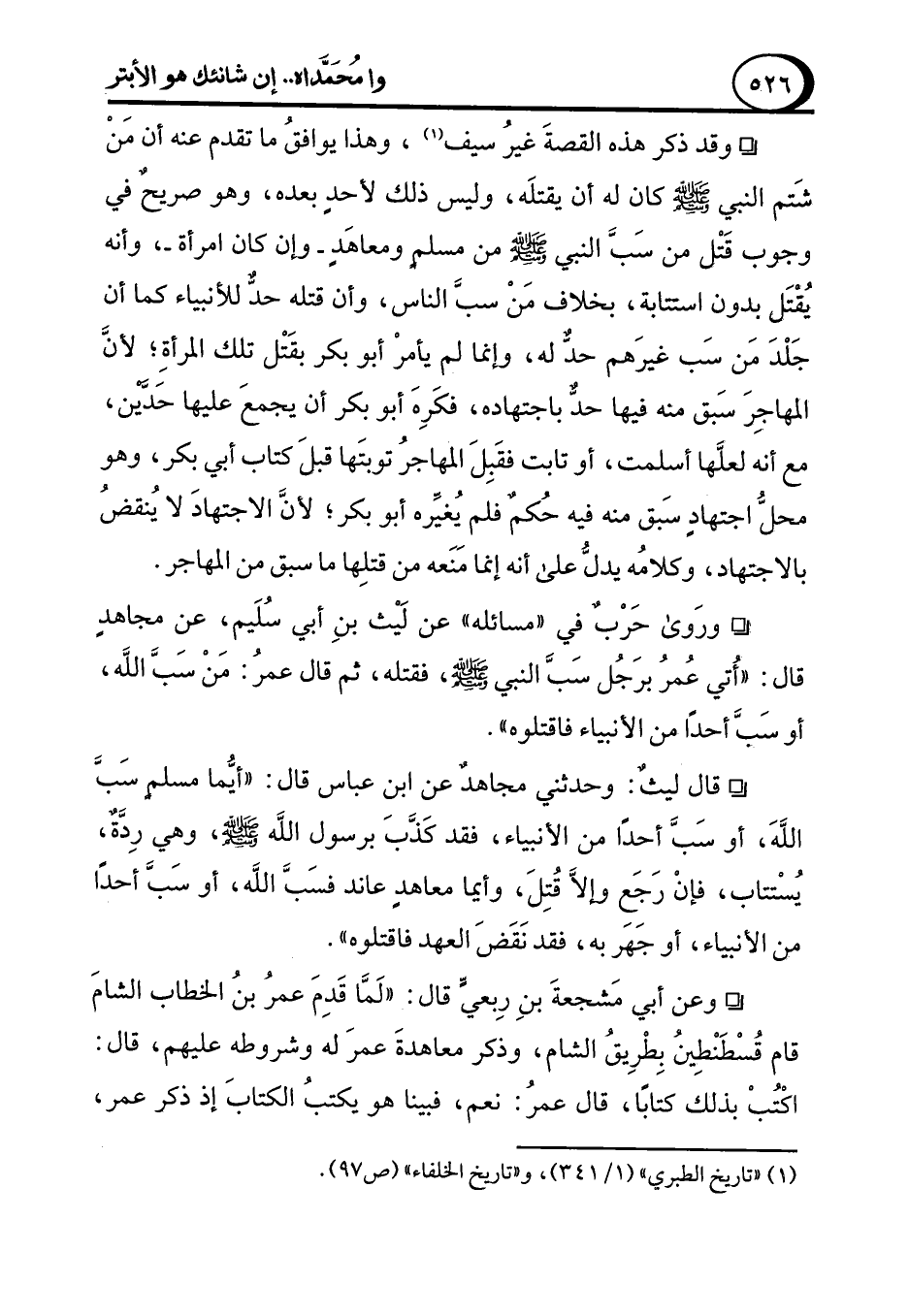 ° وقد ذكر هذه القصةَ غيرُ سيف (¬1)، وهذا يوافقُ ما تقدم عنه أن مَنْ شَتم النبي - صلى الله عليه وسلم - كان له أن يقتلَه، وليس ذلك لأحدٍ بعده، وهو صريحٌ في وجوب قَتْل من سَبَّ النبي - صلى الله عليه وسلم - من مسلمٍ ومعاهَدٍ -وإن كان امرأة-، وأنه يُقْتَل بدون استتابة، بخلاف مَنْ سبَّ الناس، وأن قتله حدٌّ للأنبياء كما أن جَلْدَ مَن سَب غيرَهم حدٌّ له، وإنما لم يأمرْ أبو بكر بقَتْل تلك المرأةِ؛ لأن الهاجِرَ سَبق منه فيها حدٌّ باجتهاده، فكَرِهَ أبو بكر أن يجمعَ عليها حَدَّيْن، مع أنه لعلَّها أسلمت، أو تابت فقَبِلَ المهاجرُ توبتَها قبلَ كتاب أبي بكر، وهو محلُّ اجتهادٍ سَبق منه فيه حُكمٌ فلم يُغيِّره أبو بكر؛ لأنَّ الاجتهادَ لا يُنقضُ بالاجتهاد، وكلامُه يدلُّ على أنه إنما مَنَعه من قتلِها ما سبق من المهاجر.