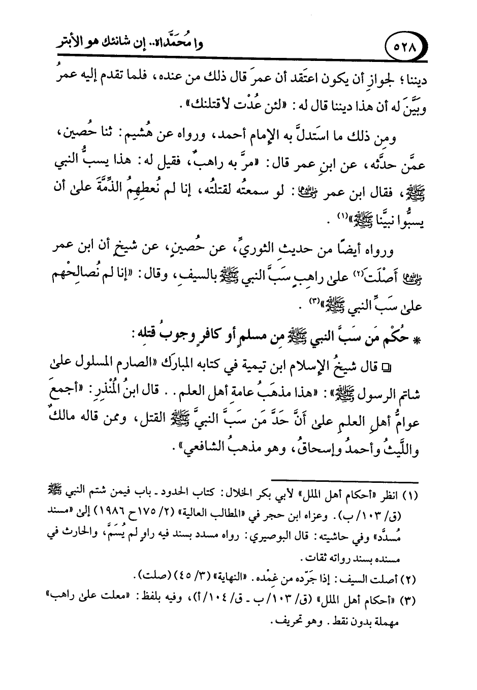 ° قال شيخُ الإسلام ابن تيمية في كتابه المبارَك "الصارم المسلول على شاتم الرسول - صلى الله عليه وسلم - ":"هذا مذهَبُ عامةِ أهل العلم .. قال ابنُ المُنْذِرِ: "أجمعَ عوامُّ أهلِ العلمِ على أَن حَدَّ مَن سبَّ النبي - صلى الله عليه وسلم - القتل، وممن قاله مالكٌ واللَّيثُ وأحمدُ وإسحاقُ، وهو مذهبُ الشافعي".