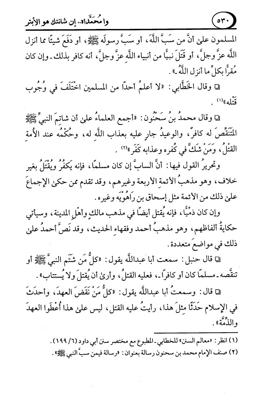 ° قال حنبل: سمعت أبا عبد الله يقول: "كلُّ مَن شَتَم النبيَّ - صلى الله عليه وسلم - أو تنقَّصه -مسلما كان أو كافرًا-، فعليه القتلُ، وأرى أن يُقتلَ ولا يُستتاب".