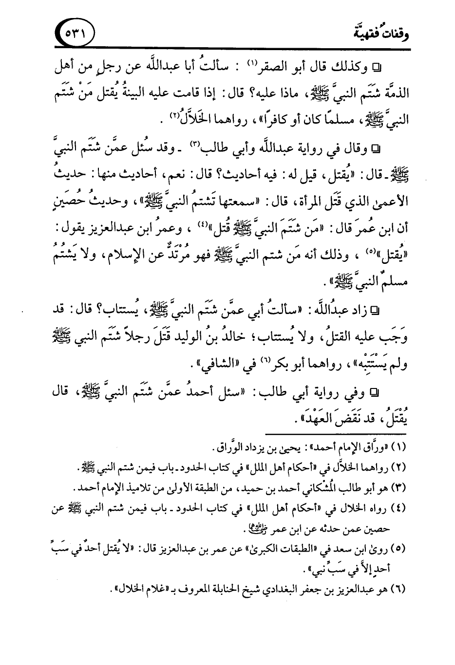 (¬5) روى ابن سعد في "الطبقات الكبرى" عن عمر بن عبد العزيز قال: "لا يُقتل أحدٌ في سَبِّ أحدٍ إلاَّ في سَبِّ نبي".