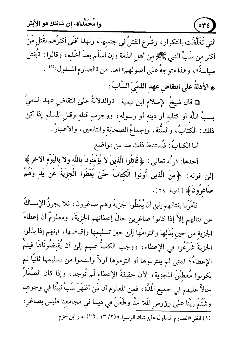 ° قال شيخُ الإِسلام ابن تيمية: "والدلالةُ على انتقاضِ عهد الذميِّ بسبِّ اللهِ أو كتابهِ أو دينهِ أو رسولهِ، ووجوبِ قتلهِ وقتلِ المسلم إذا أتى ذلك: الكتابُ، والسُّنة، وإجماعُ الصحابةِ والتابعين، والاعتبارُ.