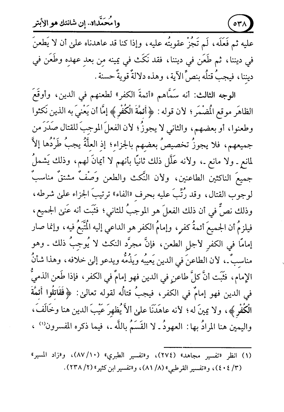 الوجه الثالث: أنه سَمَّاهم "أئمةَ الكفر" لطعنهم في الدين، وأوقَعَ الظاهَر موقع المُضْمَر؛ لأن قوله: {أَئِمَّةَ الْكُفْرِ} إمَّا أن يَعْنيَ به الذين نَكثوا وطعنوا، أو بعضهم، والثاني لا يجوزُ؛ لأن الفعلَ الموجِبَ للقتال صَدَرَ من جميعهم، فلا يجوزُ تخصيصُ بعضِهم بالجزاءِ؛ إذِ العِلَّةُ يجبُ طَرْدُها إلاَّ لمانعٍ -ولا مانع-، ولأنه عَلَّل ذلك ثانيًا بأنهم لا أيمانَ لهم، وذلك يَشملُ جميعَ الناكثين الطاعنين، ولأن النَّكث والطعن وَصفٌ مشتق مناسب لوجوب القتال، وقد رُتِّبَ عليه بحرفِ "الفاء" ترتيبَ الجزاء على شرطه، وذلك نصٌّ في أن ذلك الفعلَ هو الموجبُ للثاني؛ فثَبَت أنه عَنى الجميع، فيلزمُ أن الجميعَ أئمةُ كفرٍ، وإمامُ الكفر هو الداعي إليه المُتّبَعُ فيه، وإنما صار إمامًا في الكفرِ لأجلِ الطعن، فإنَّ مجرَّد النكث لا يُوجِبُ ذلك -وهو مناسِبٌ -، لأن الطاعنَ في الدين يَعيبُه وَيذُمُّه ويدعو إلى خلافه، وهذا شأنُ الإمام، فثَبَت أن كل طاعنٍ في الدين فهو إمامٌ في الكفر، فإذا طعن الذميُّ في الدين فهو إمامٌ في الكفر، فيجبُ قتالُه لقوله تعالى: {فَقَاتلُوا أَئِمَّةَ الْكُفْرِ}، ولا يمينَ له؛ لأنه عاهَدَنَا على ألاَّ يُظهِرَ عَيْبَ الدين هنا وخَالَفَ، واليمين هنا المراد بها: العهودُ -لا القَسَمُ بالله-، فيما ذكره المفسرون (¬1)،